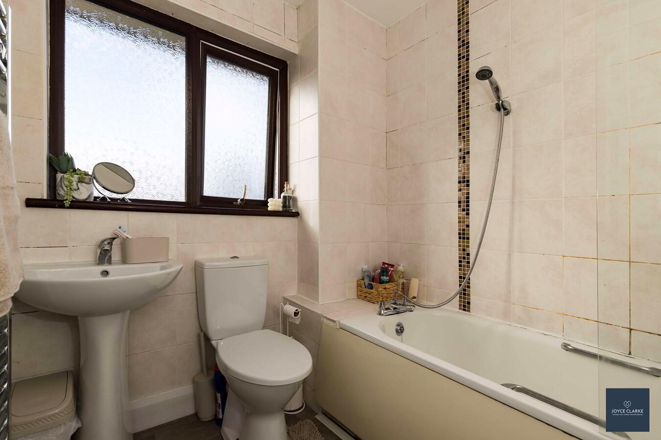 Bath with electric MIRA shower over and slower attachment to taps. WC. Pedestal style sink. Heated towel rail and laminate flooring. Hotpress.