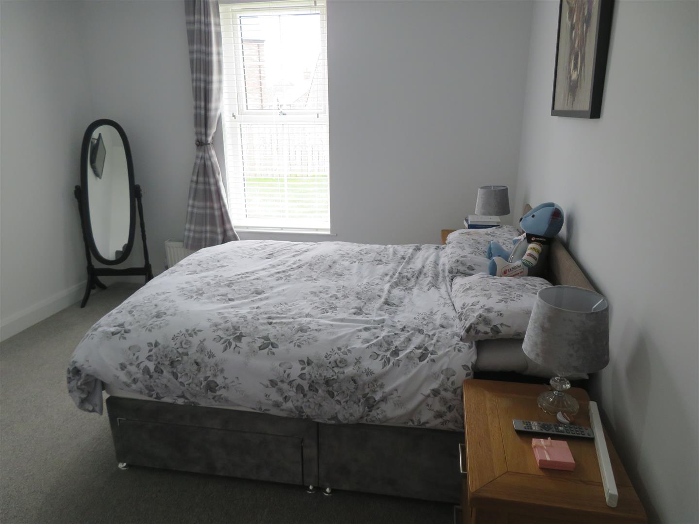 Rear aspect master bedroom with carpet flooring.