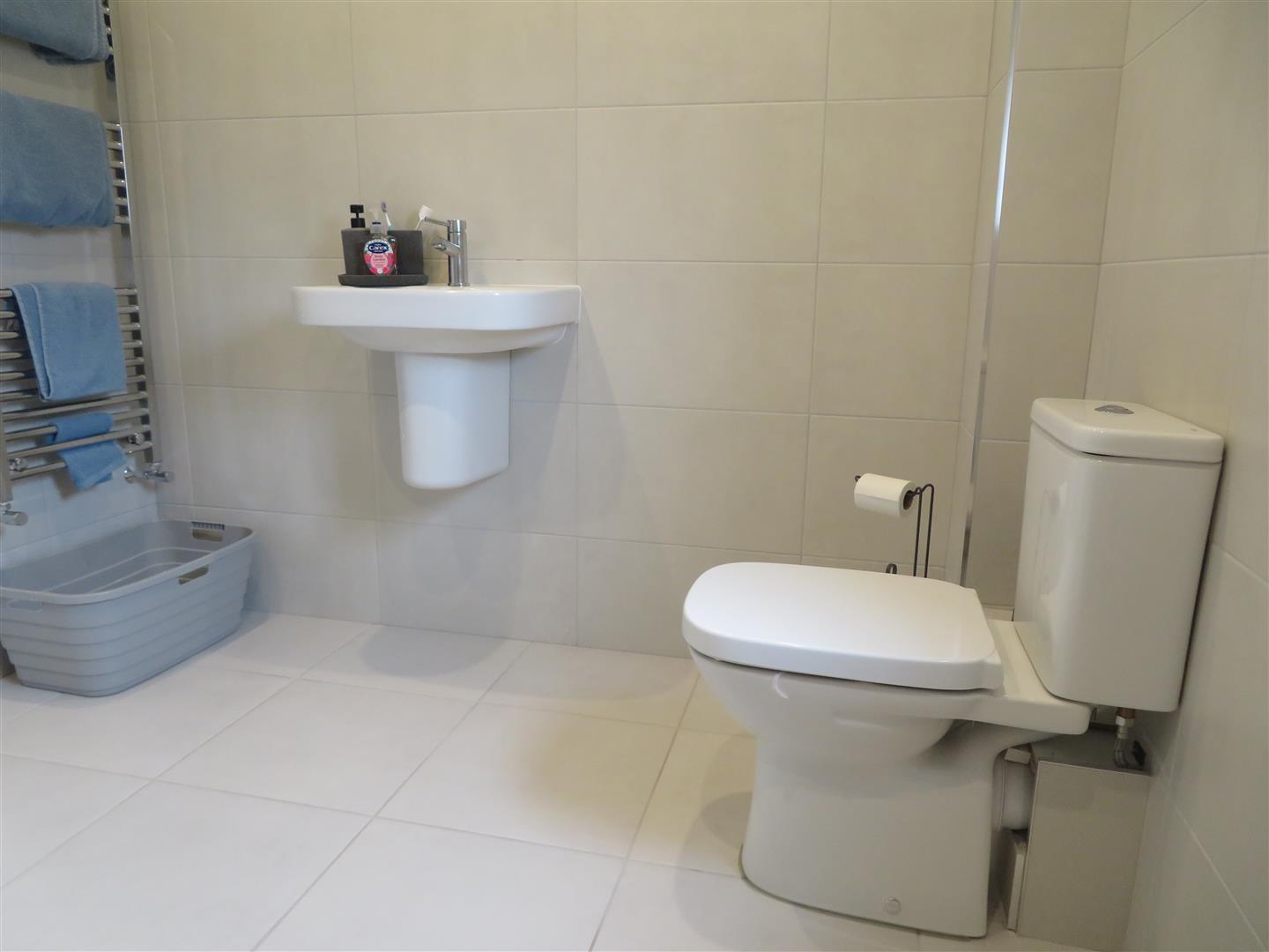 Large walk in shower cubicle with mains powered shower, WC and wall hung wash hand basin. Fully tiled walls and floor.