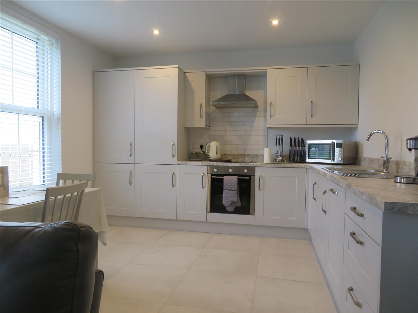 A good range of high and low level units with built in oven and hob with extractor fan above, integrated fridge/freezer and dishwasher, 1 ½ bowl sink and recessed lighting. Partially tiled walls and tiled floor. Wall mounted electric fire and laminate flooring in living area.