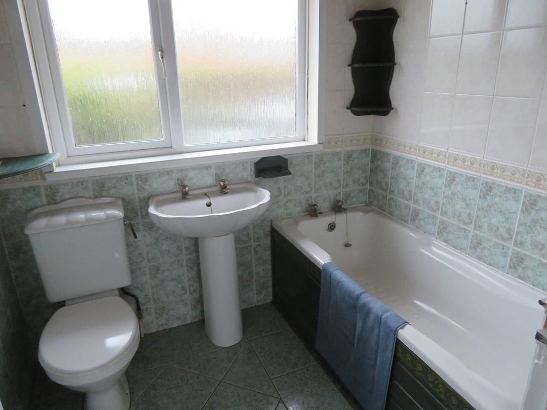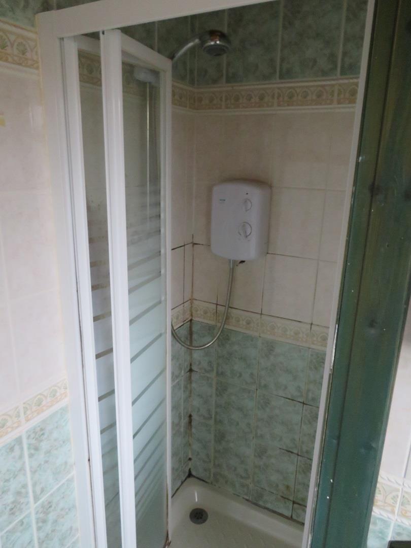 Panel bath, walk in shower cubicle with electric shower, WC and pedestal wash hand basin. Tongue & Groove ceiling. Fully tiled walls and floor.