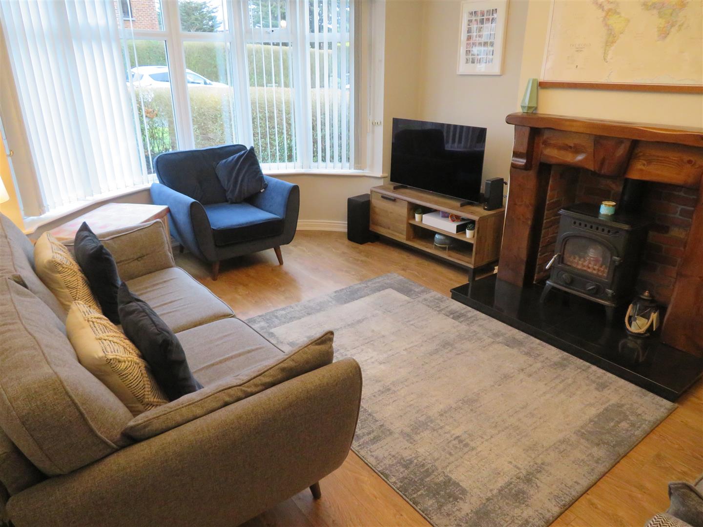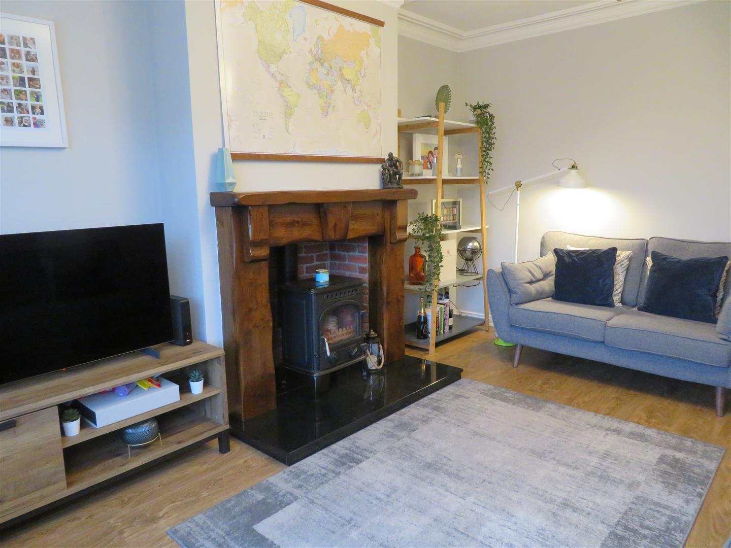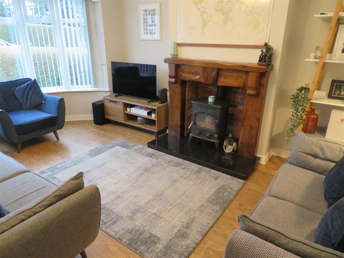 Bright living room benefitting from feature bay window, wood burning stove set on granite hearth with timber surround and laminate flooring.