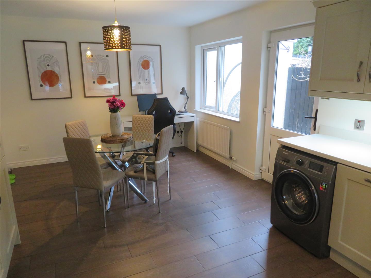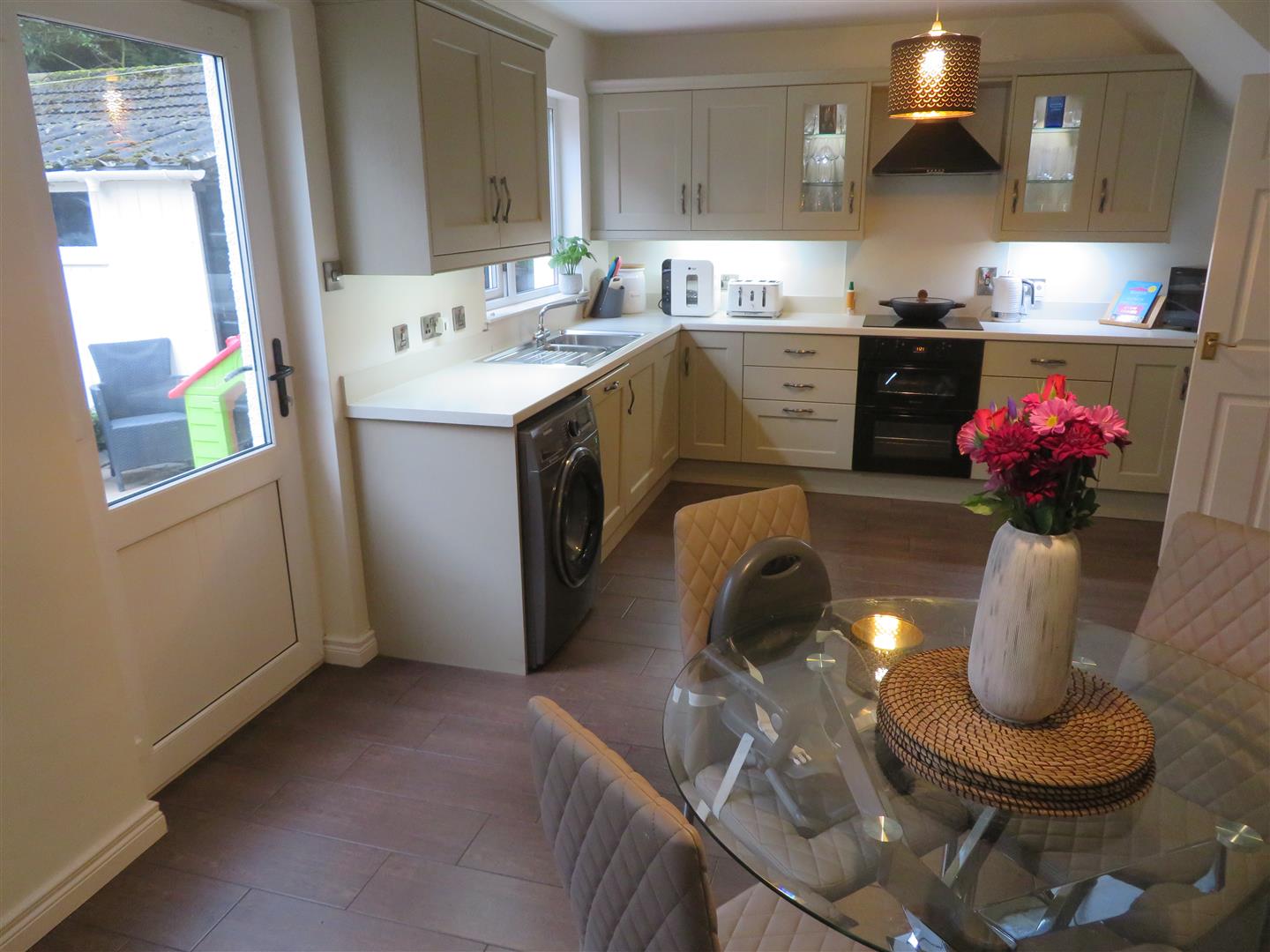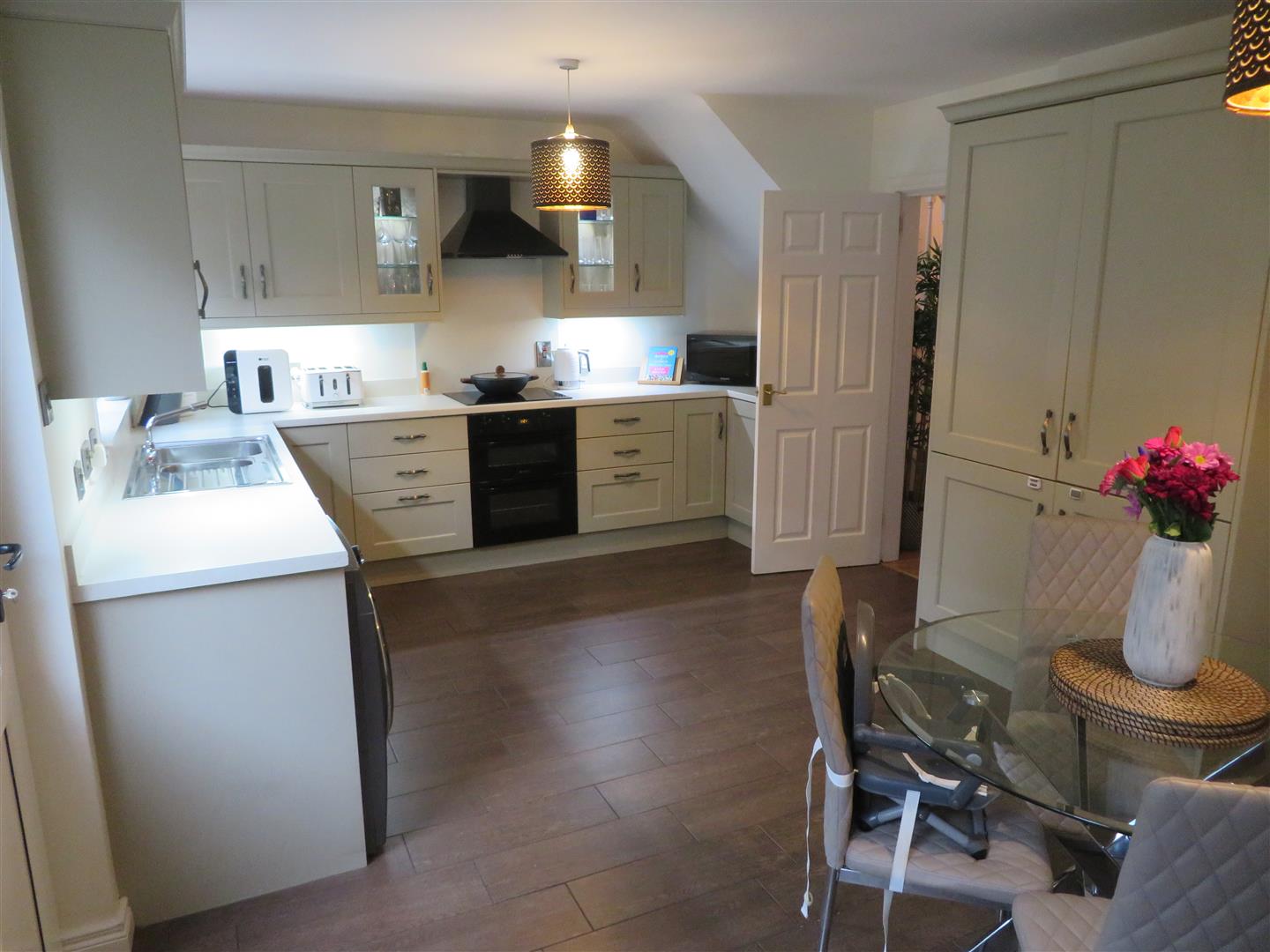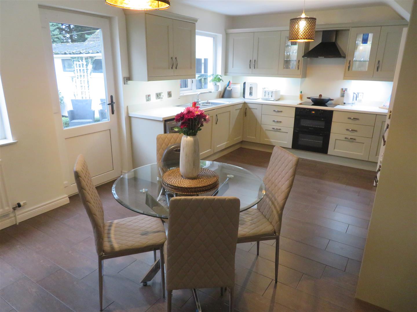 Spacious open plan kitchen/dining area. Modern kitchen with a great range of high and low level units including large larder, built in double oven and hob with extractor above, integrated fridge, freezer and dishwasher, plumbed space for washing machine, wood effect tiled flooring and PVC glazed back door to rear.