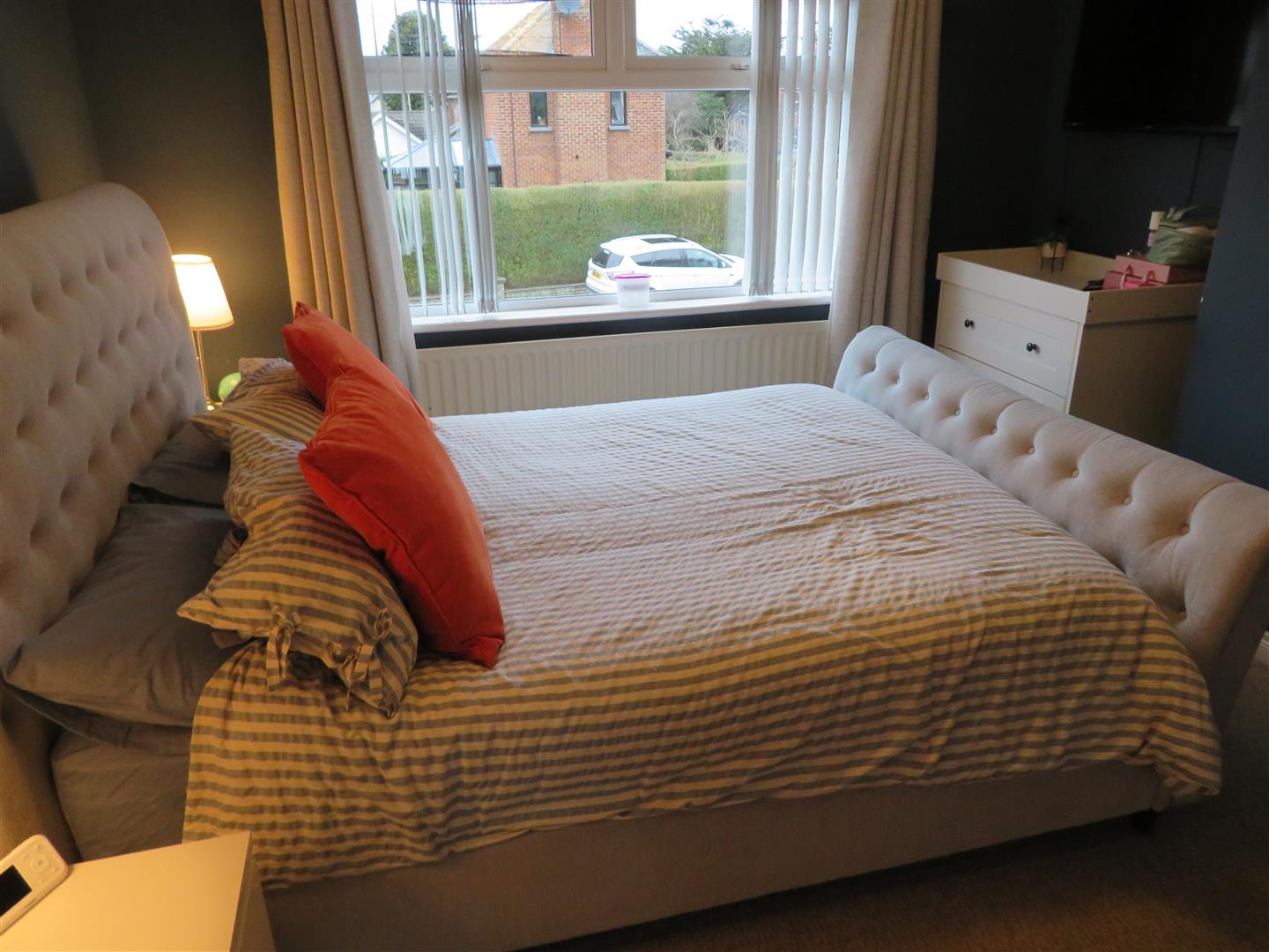Front aspect master bedroom with carpet flooring.