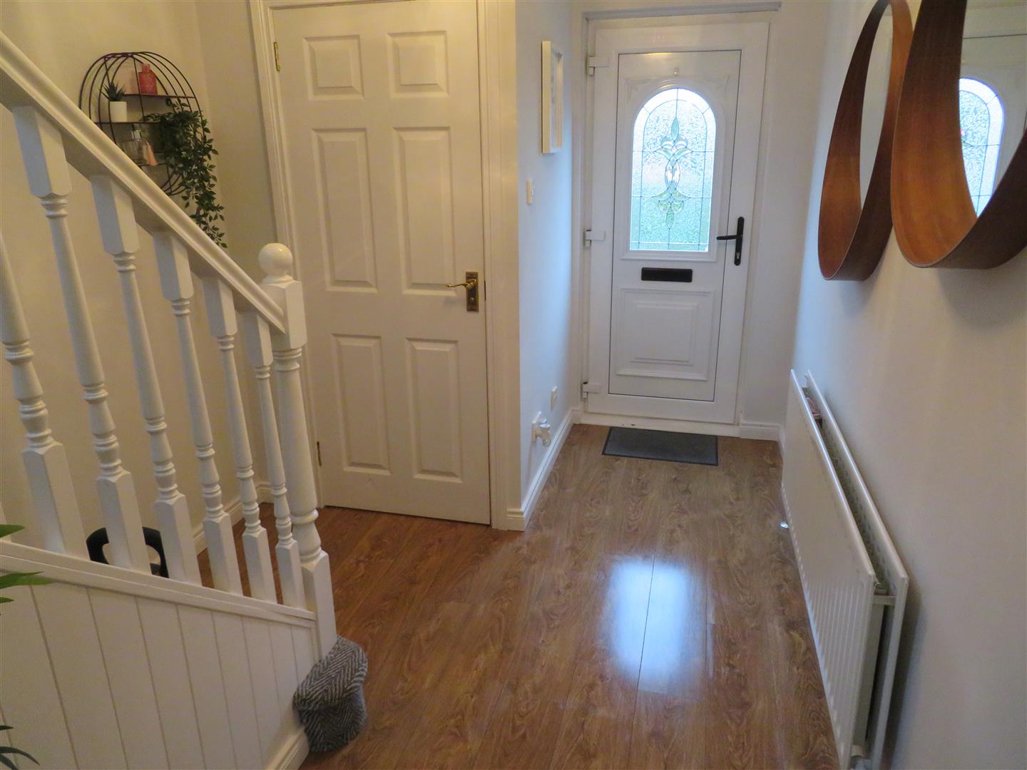 Accessed via PVC front door with laminate flooring and built in storage under stairs.