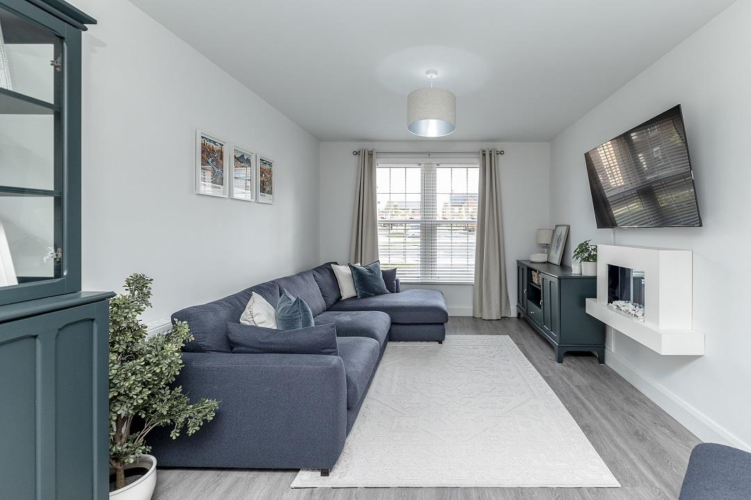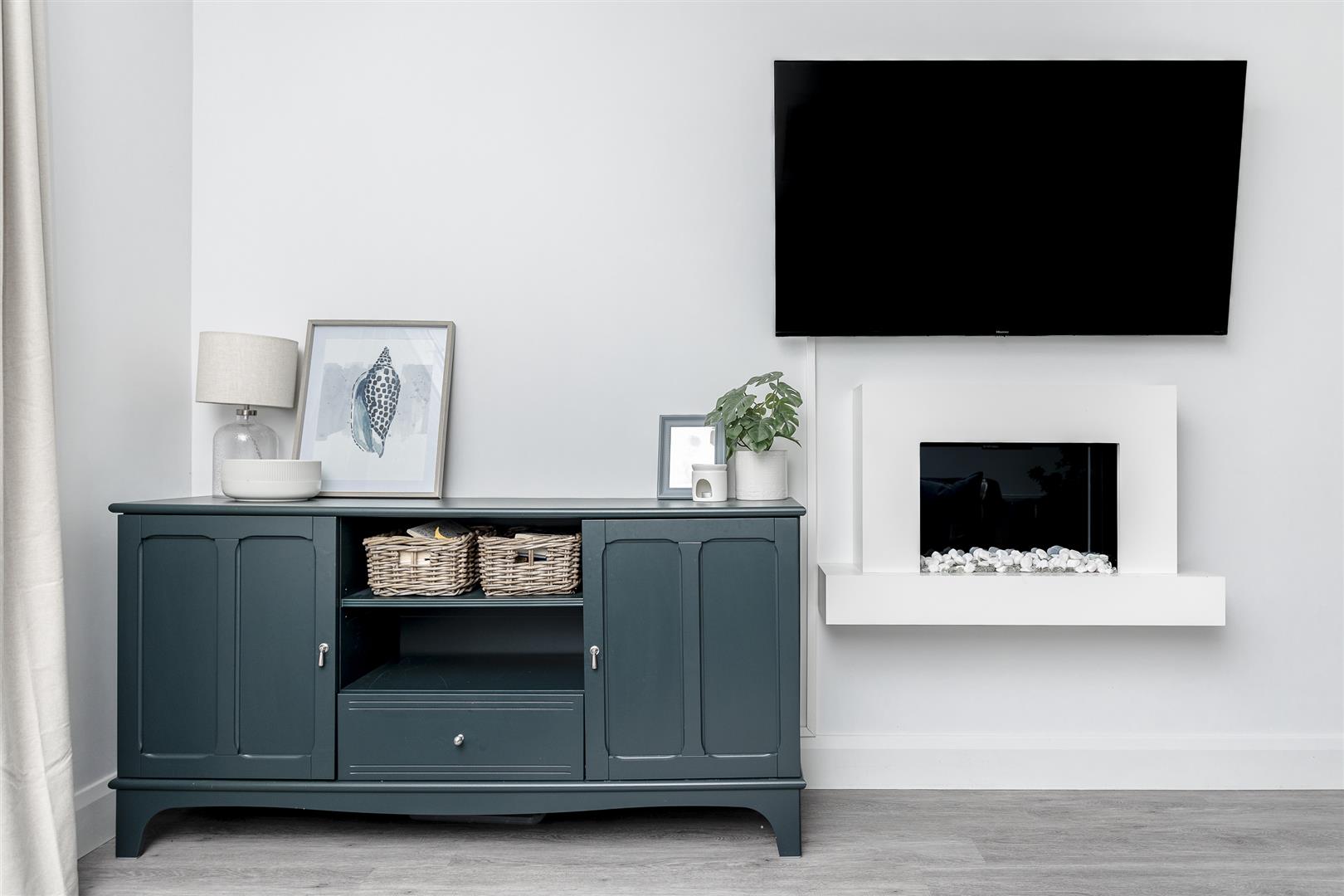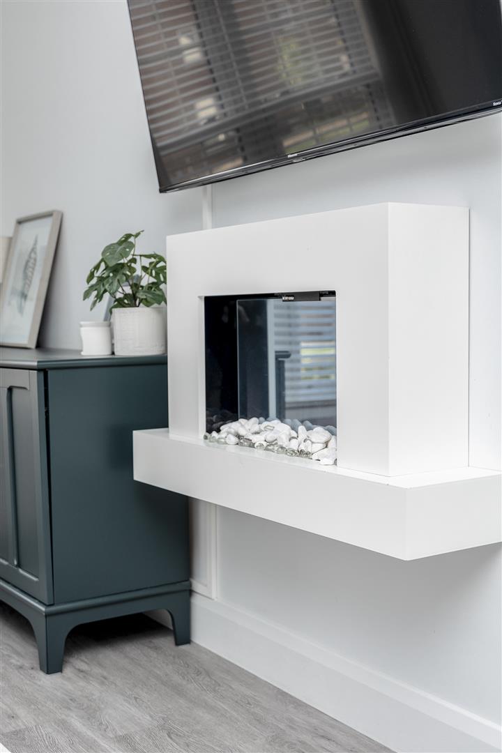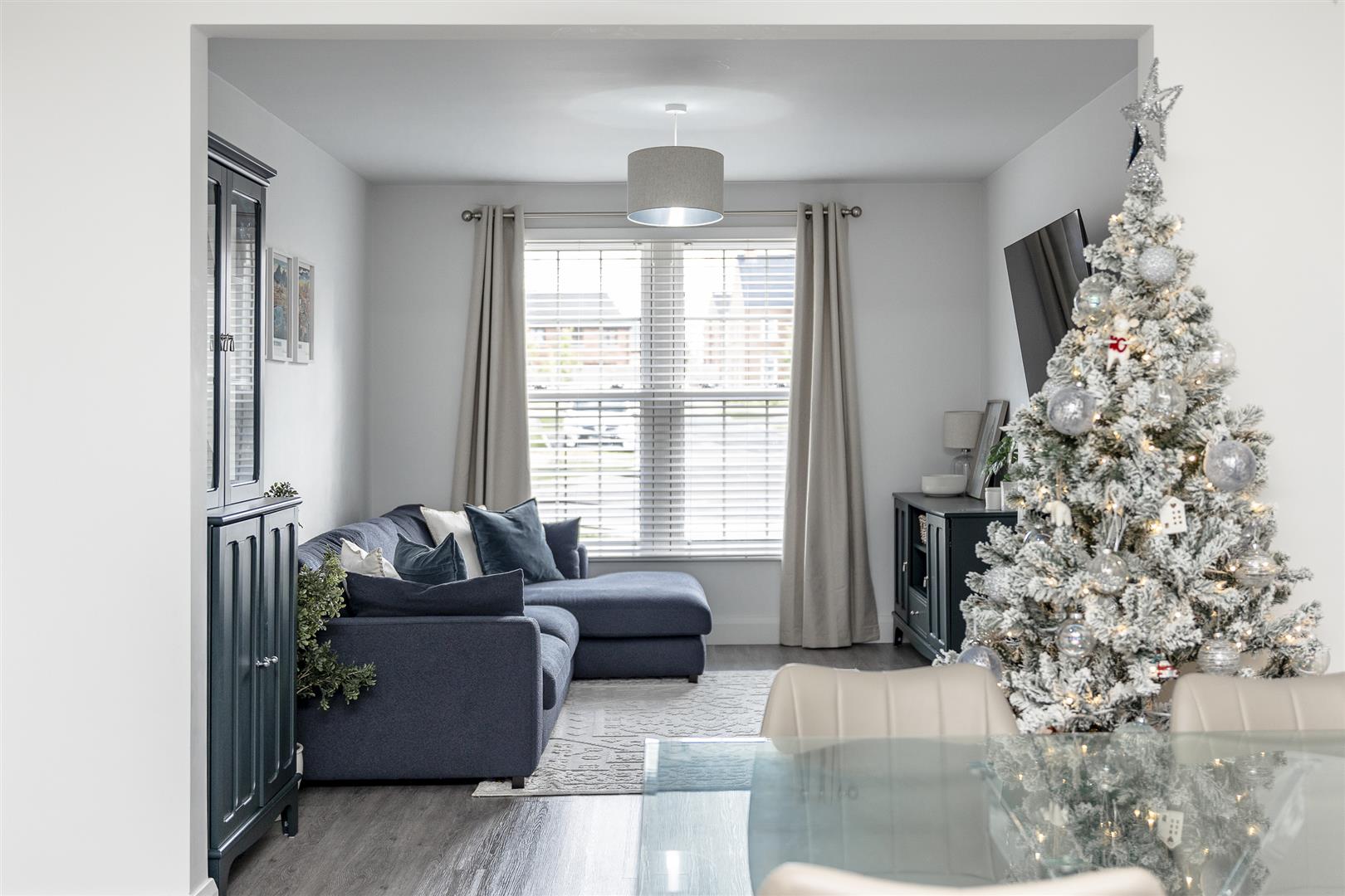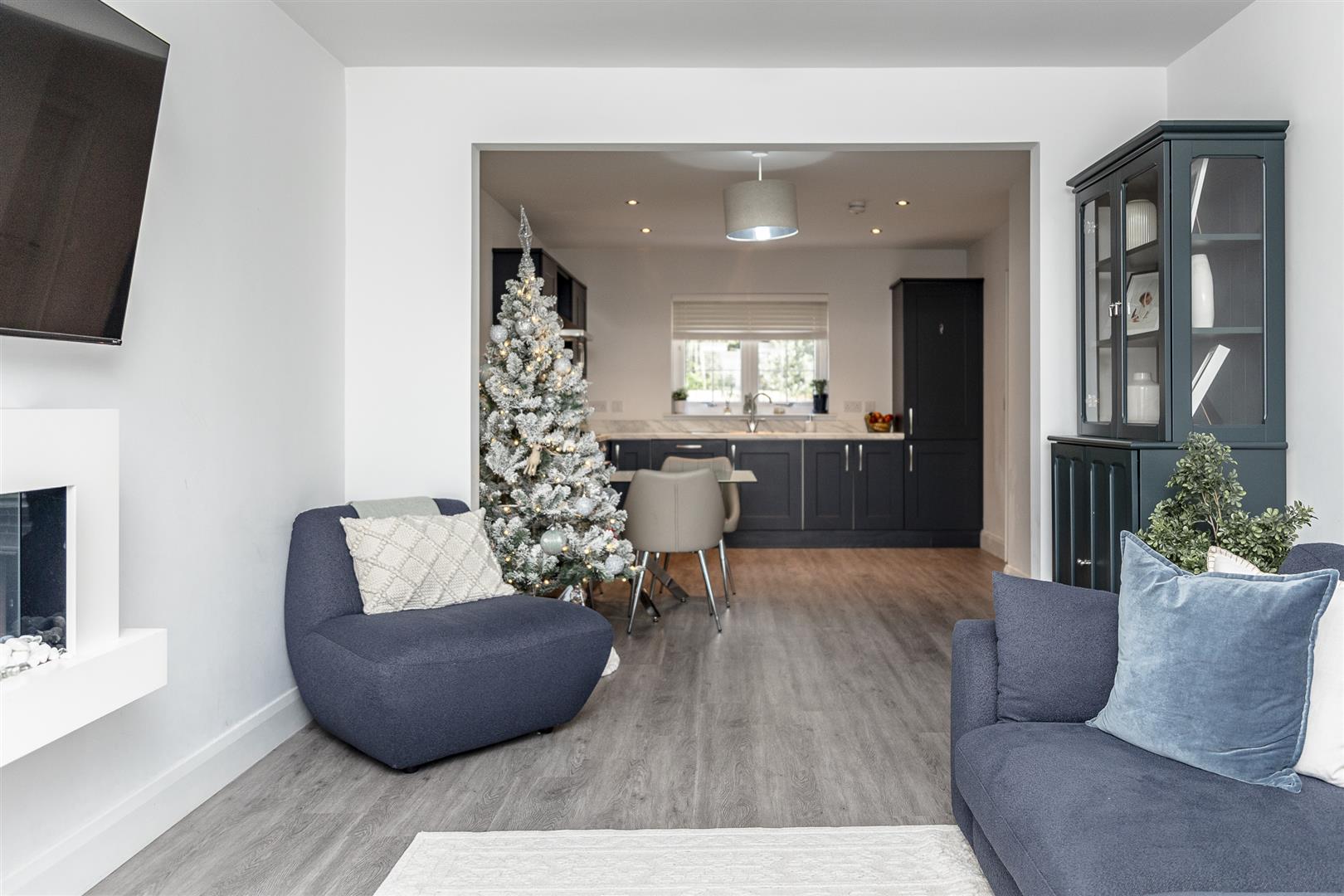 Bright reception room with laminate flooring and contemporary wall mounted electric fire. Open plan through to kitchen.