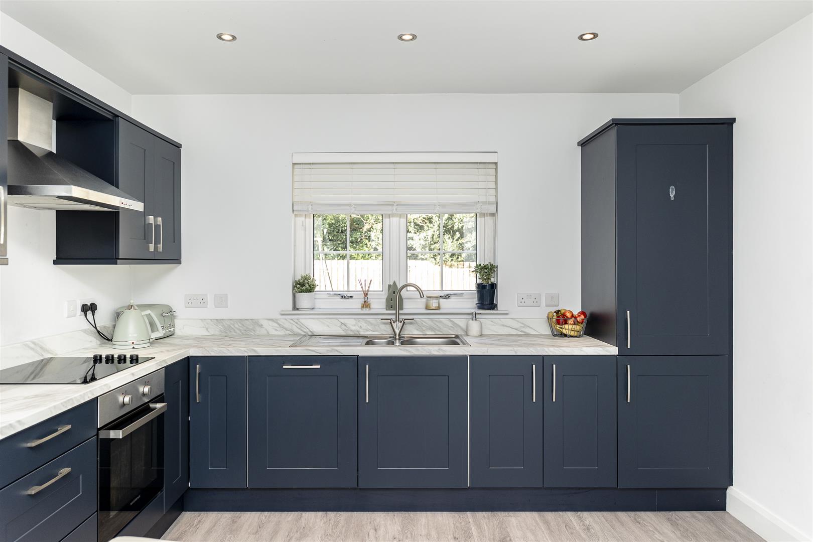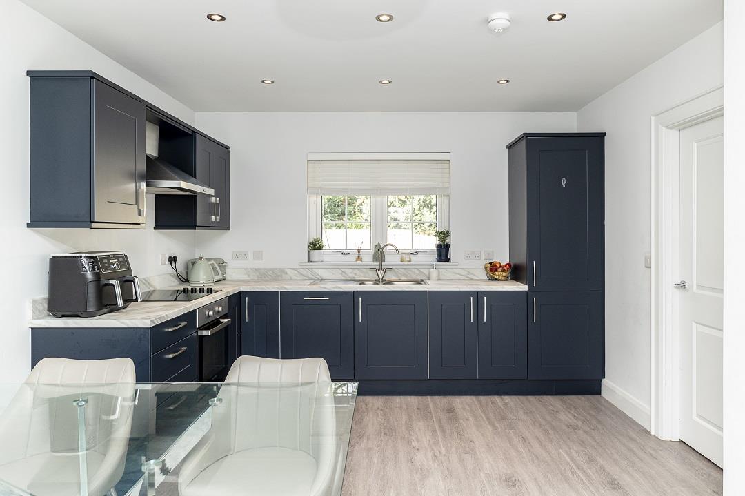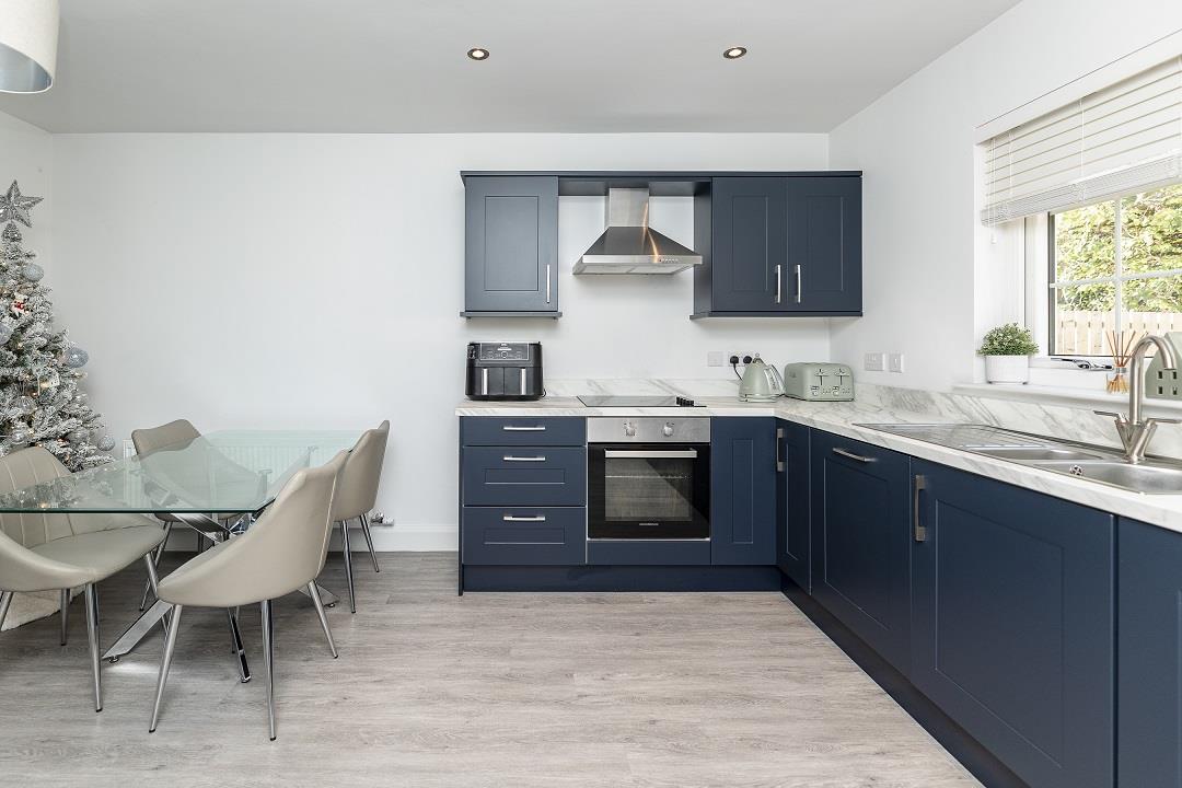 Attractive fitted kitchen with good range of high and low level fitted units with contrasting work top. Built in oven and hob with stainless steel extractor above, integrated fridge freezer and dishwasher, recessed lights, laminate flooring.