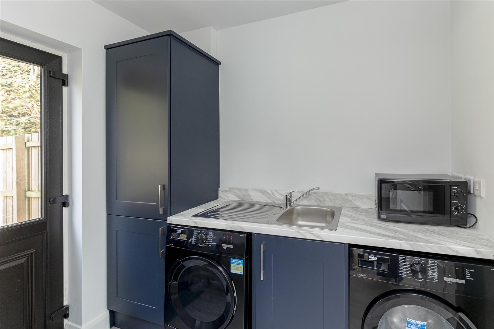 Plumbed space for washing machine, space for tumble dryer, stainless steel sink unit with drainer, fitted units, back door to rear and laminate flooring.