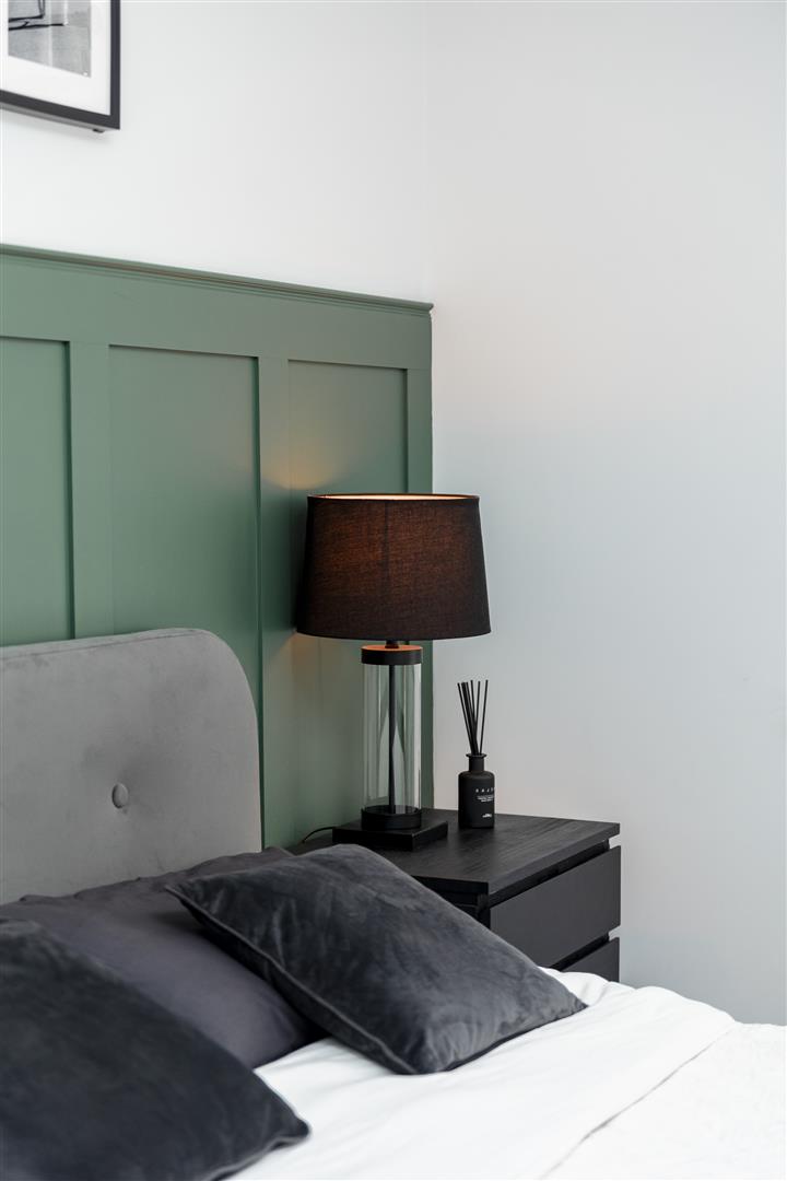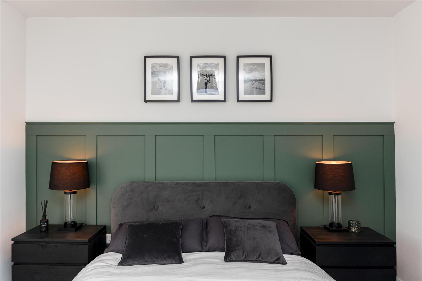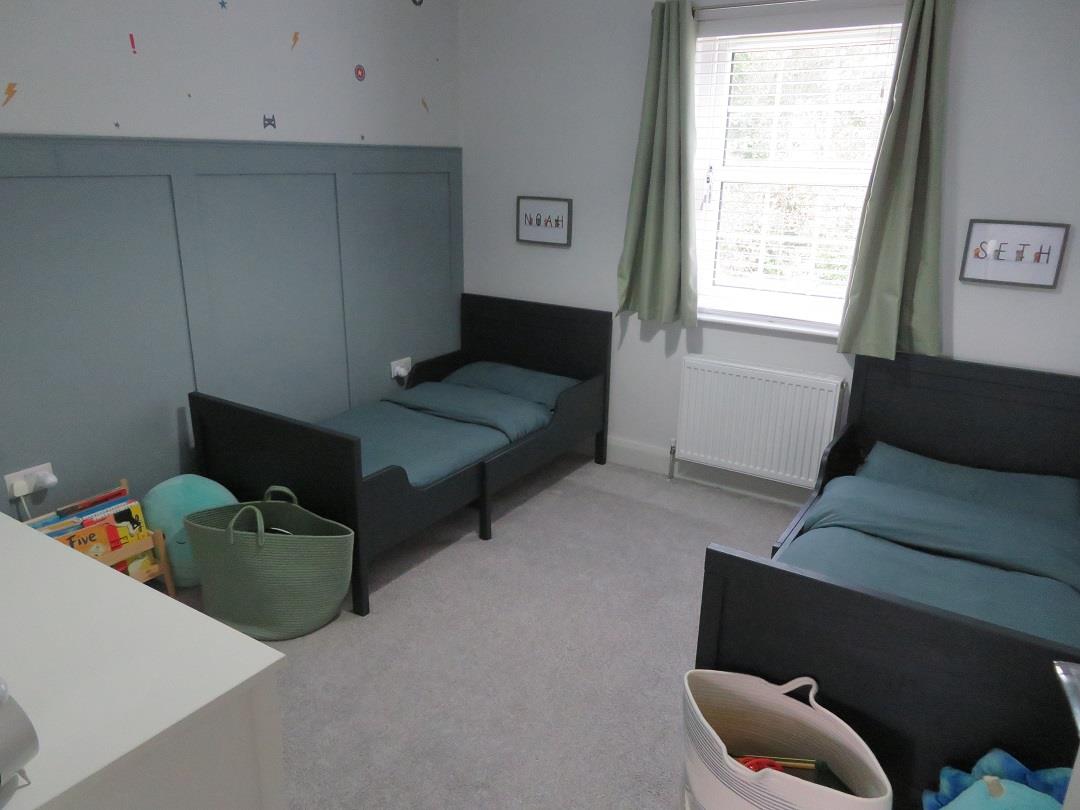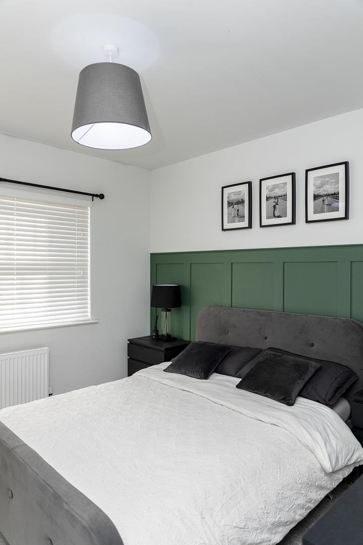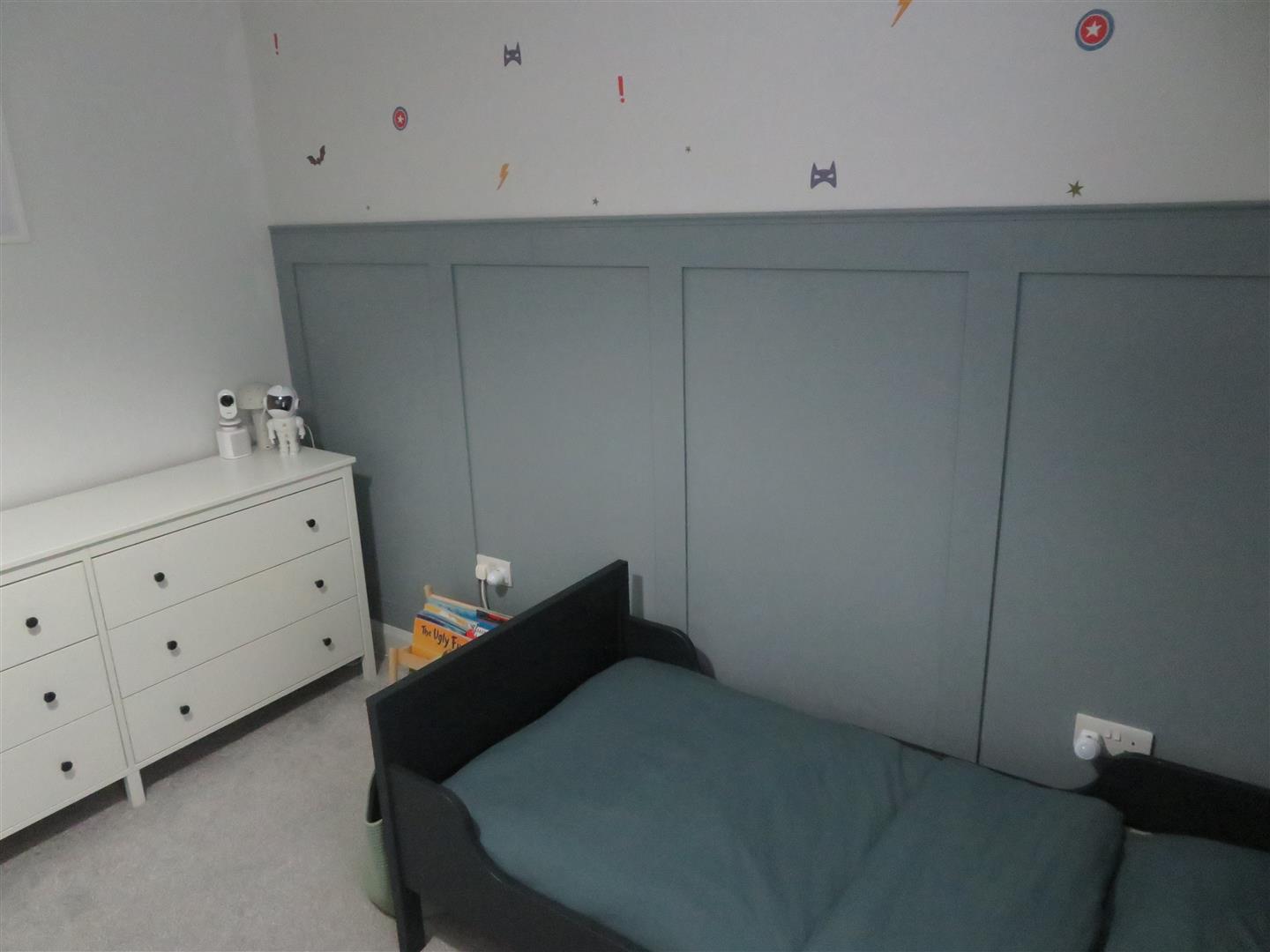 Rear aspect double bedroom with carpet flooring and feature panelling to walls.
