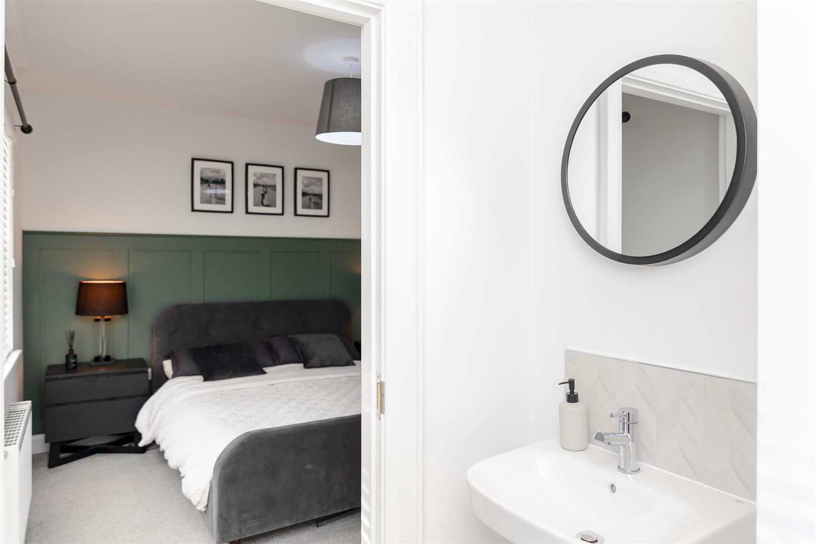 Front aspect master ensuite bedroom with feature panelling, carpet flooring and built in wardrobe.