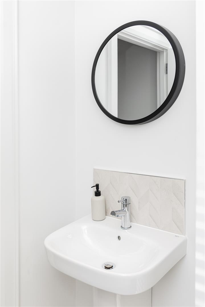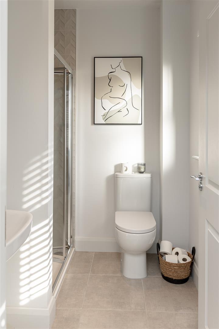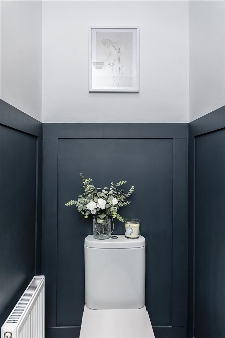 Dual flush WC, wash hand basin, tiled flooring and feature panelling to walls.