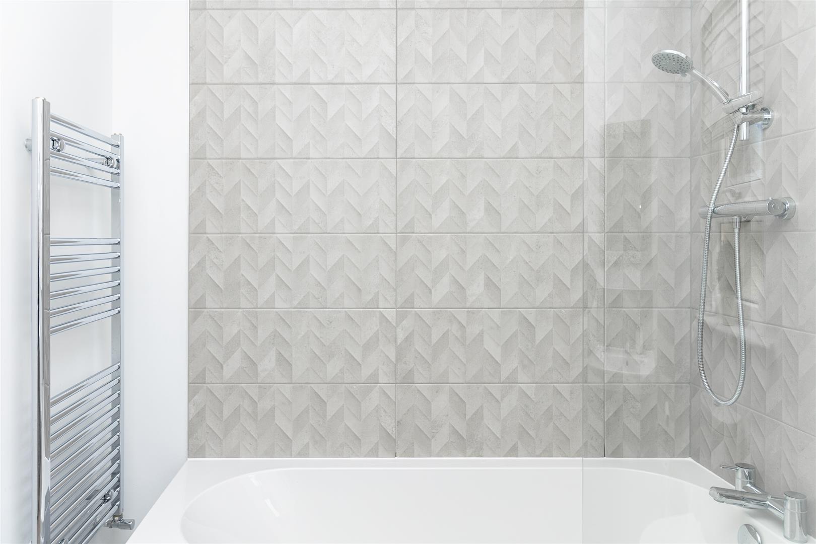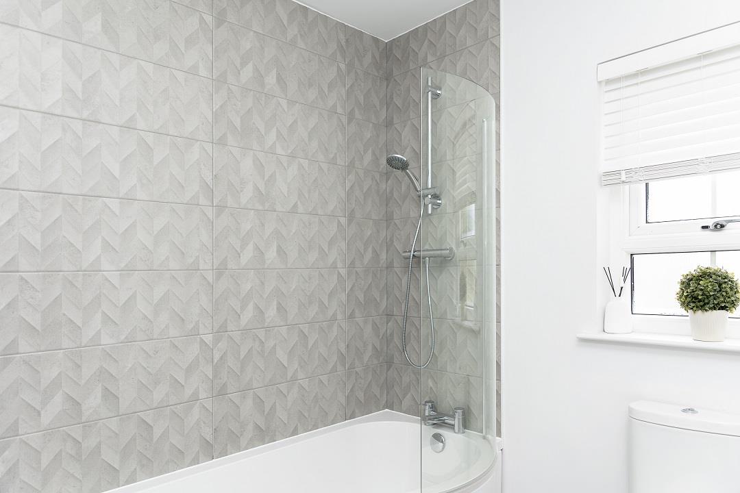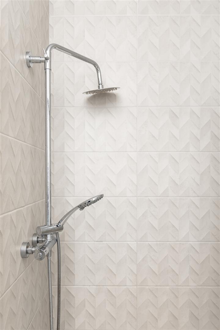 Mains powered shower with drencher head, wash hand basin and dual flush WC, tiled floor and partially tiled walls.