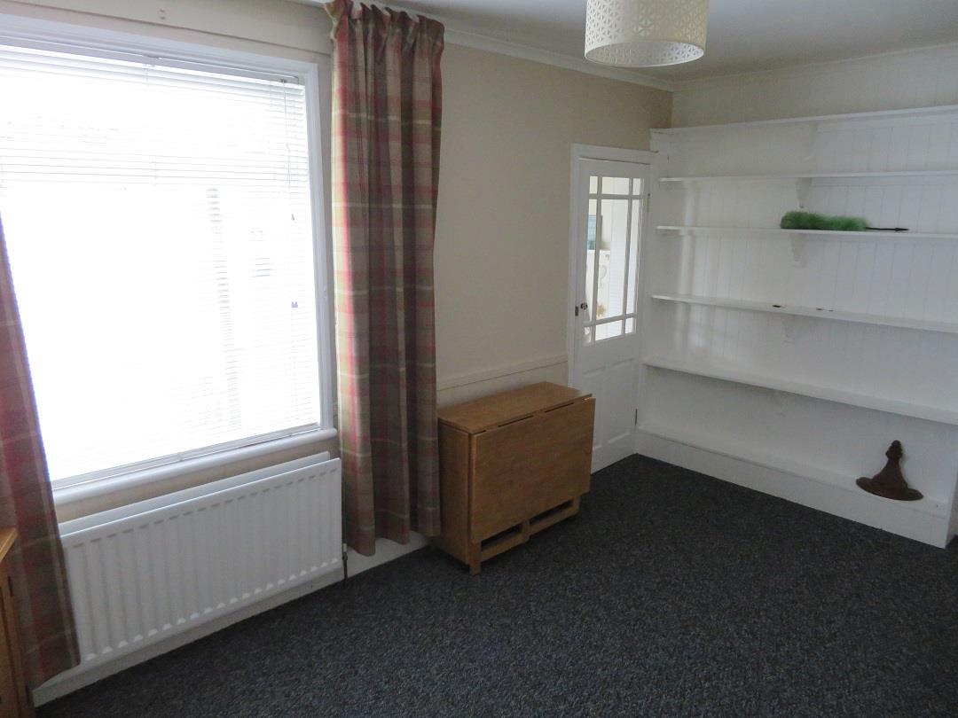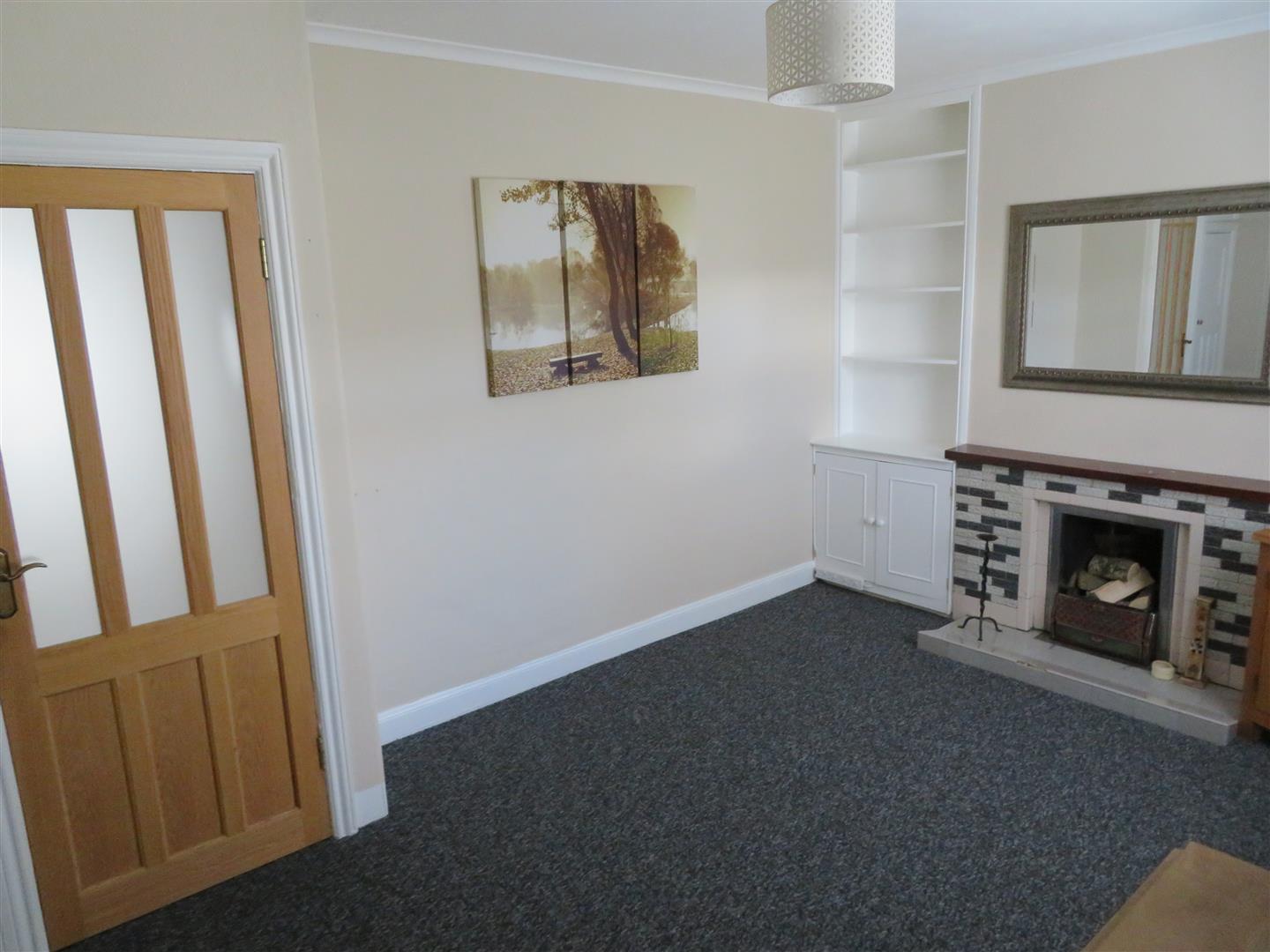 Rear aspect reception room with traditional tiled fireplace housing open fire, built in storage under stair and carpet flooring.
