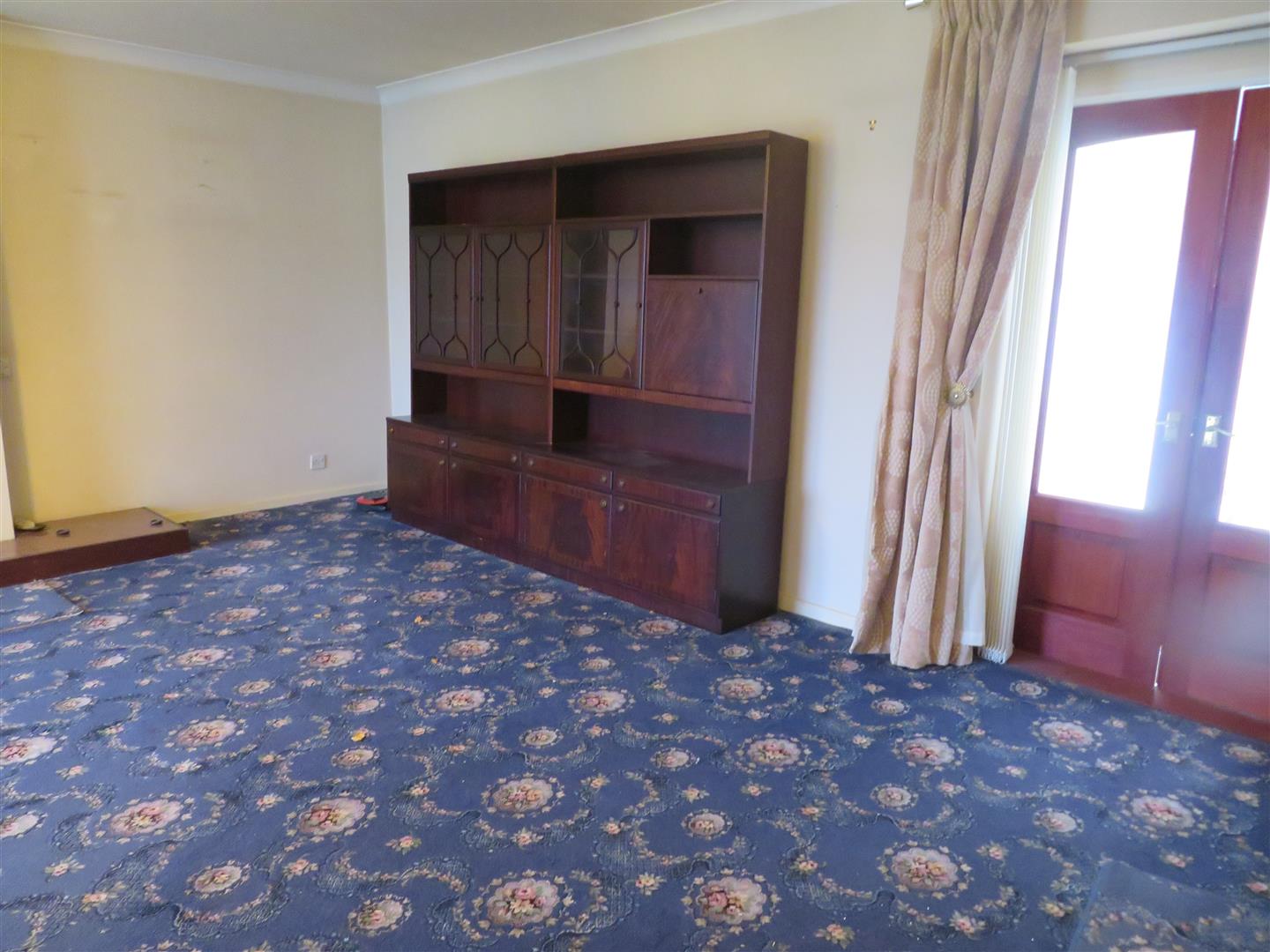Open fire with tiled hearth, cornicing and carpet flooring. Double doors through to the conservatory.
