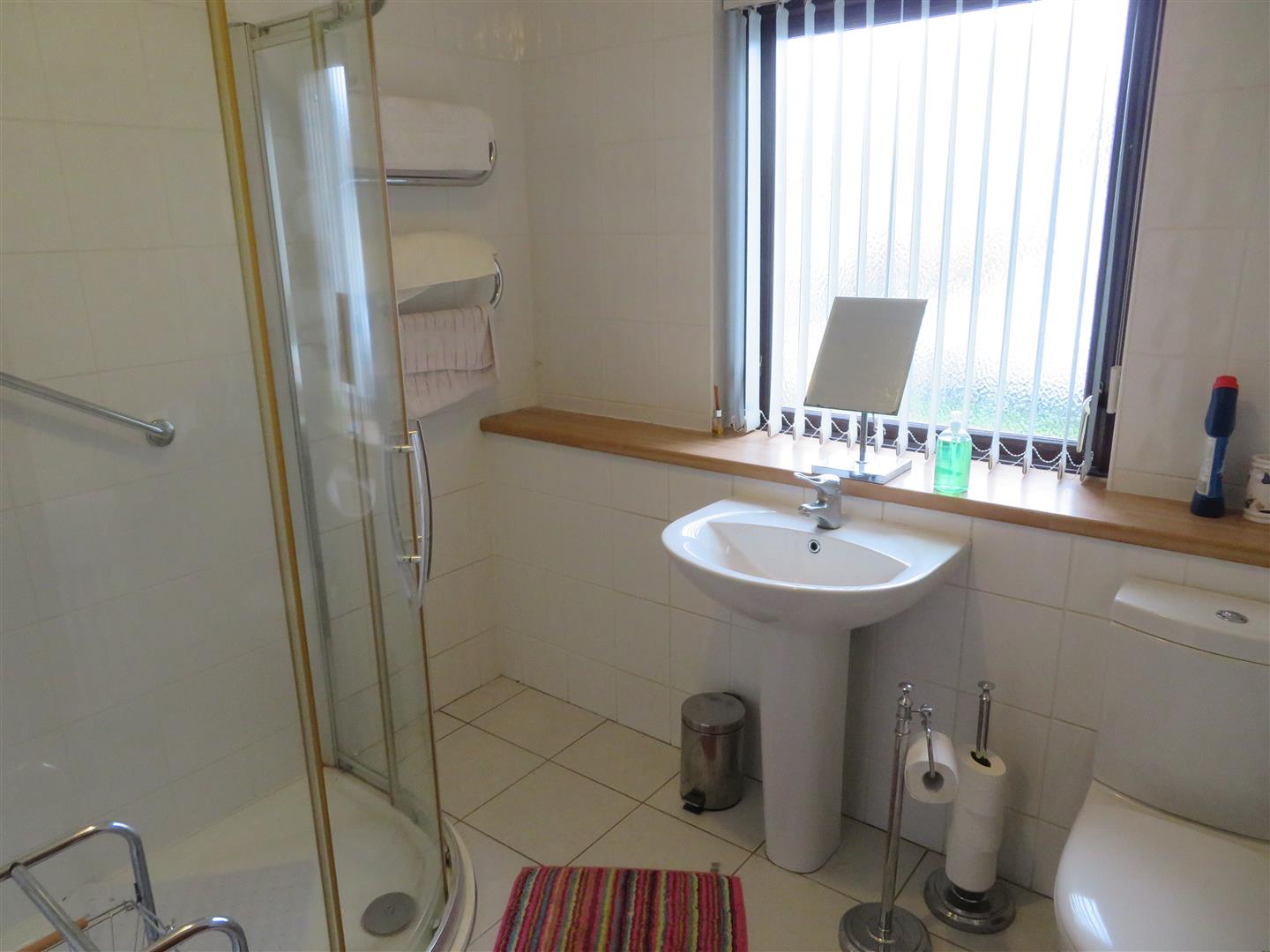 Corner shower cubicle with electric shower, WC and pedestal wash hand basin. Fully tiled walls and floor.