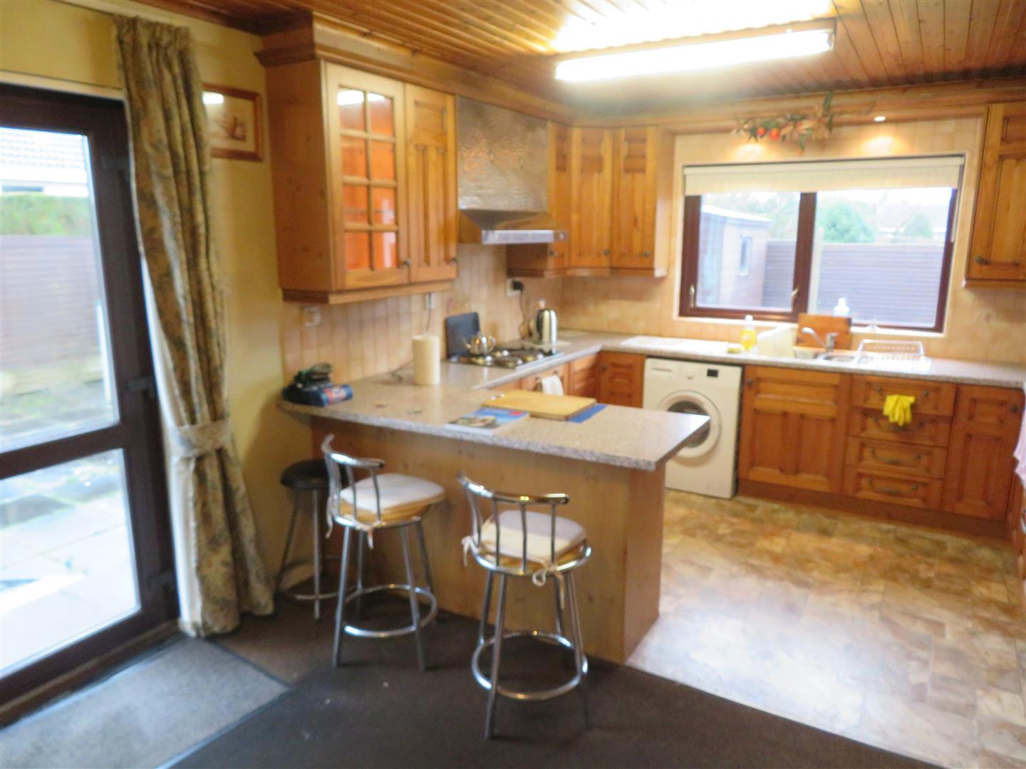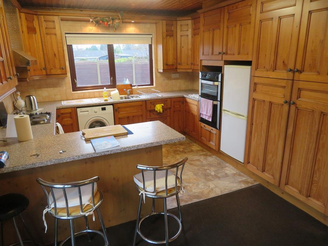 A range of high and low level units, built in hob with extractor fan above, double oven, space for fridge freezer and washing machine. Tongue & Groove ceiling, vinyl flooring in kitchen, carpet in dining. Mahogany PVC double glazed door to rear
