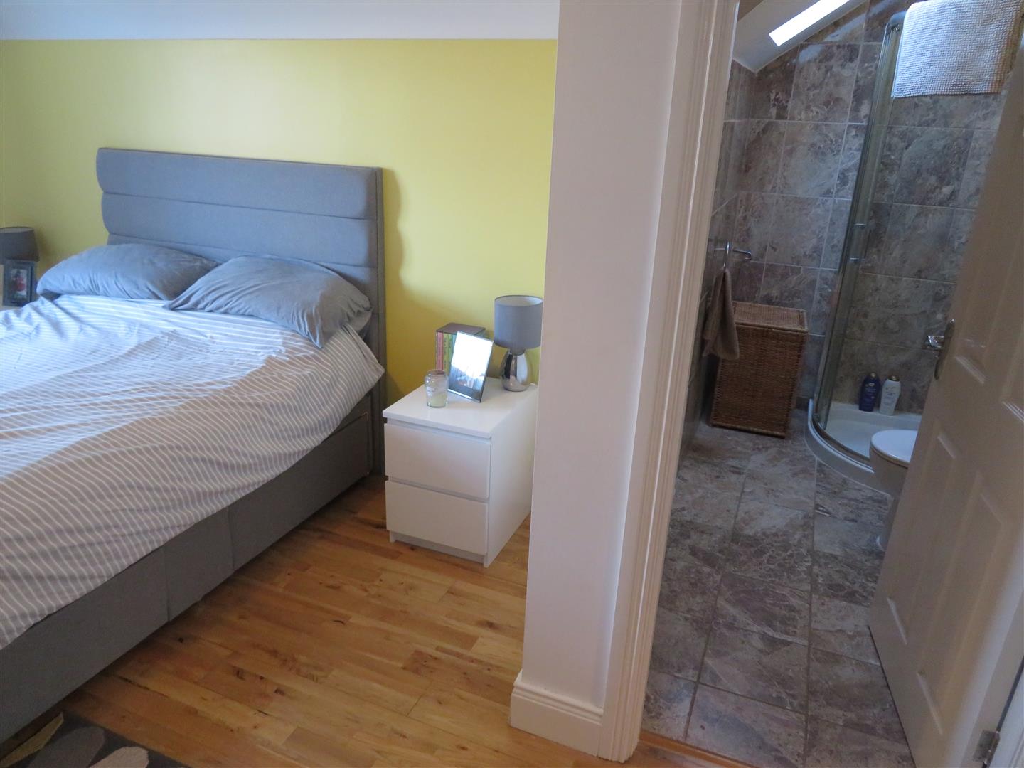 Front aspect master bedroom with great range of fitted wardrobes and drawers, solid wood flooring and ensuite shower.