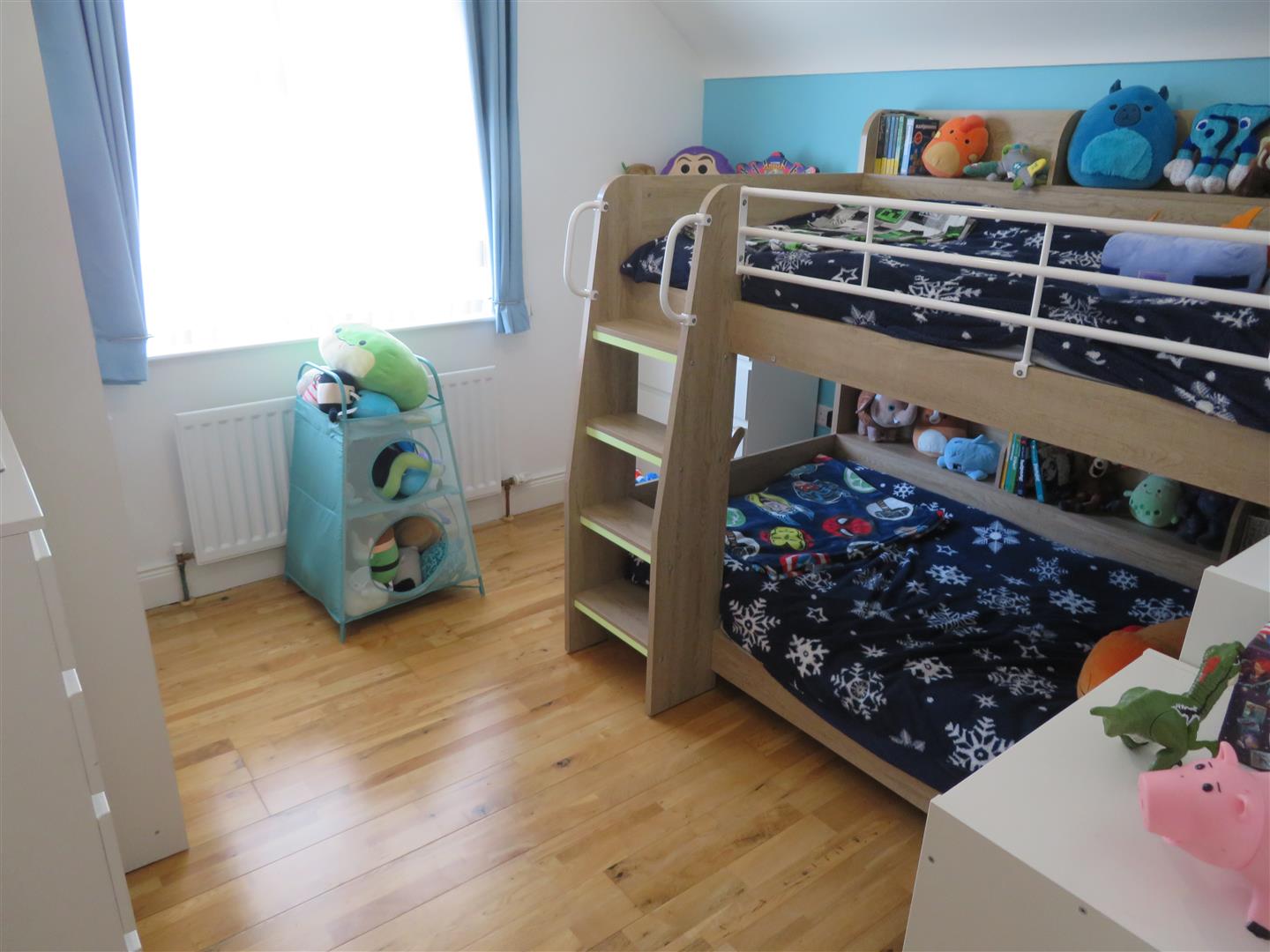 Side aspect double bedroom with solid wooden flooring.