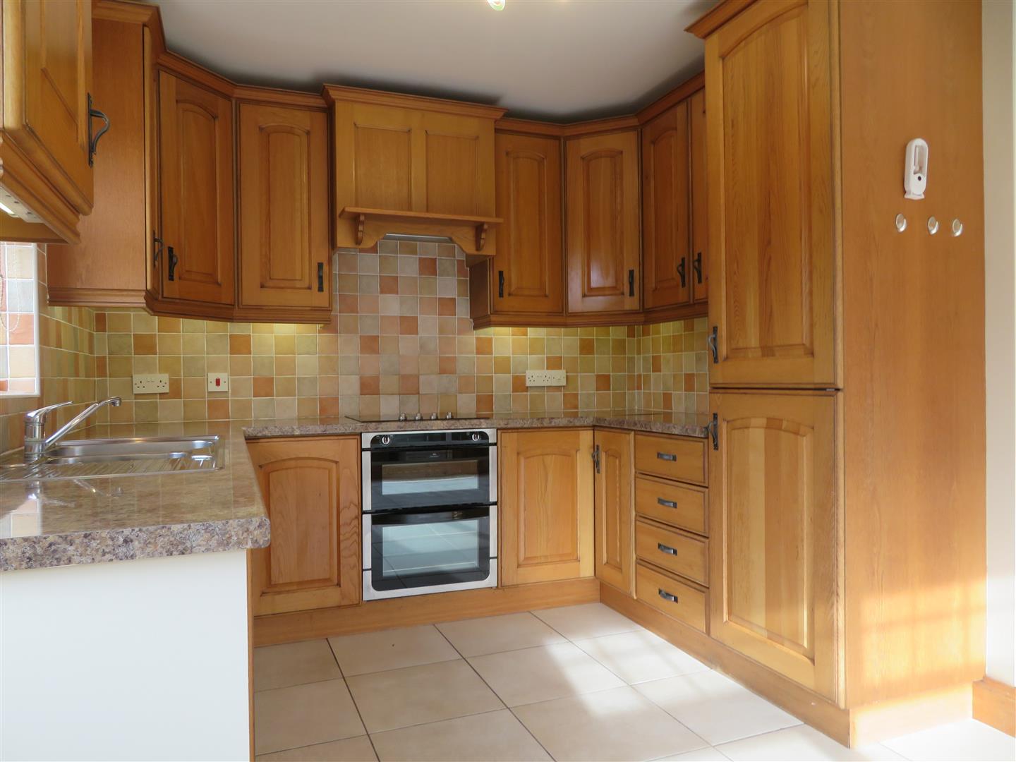 Solid wood kitchen with a range of high and low level units. Built in double oven and hob with extractor above. Integrated fridge/freezer and plumbed space for washing machine. 1 ½ bowl stainless steel sink and drainer. Partially tiled walls and fully tiled floor. Timber door to rear garden.