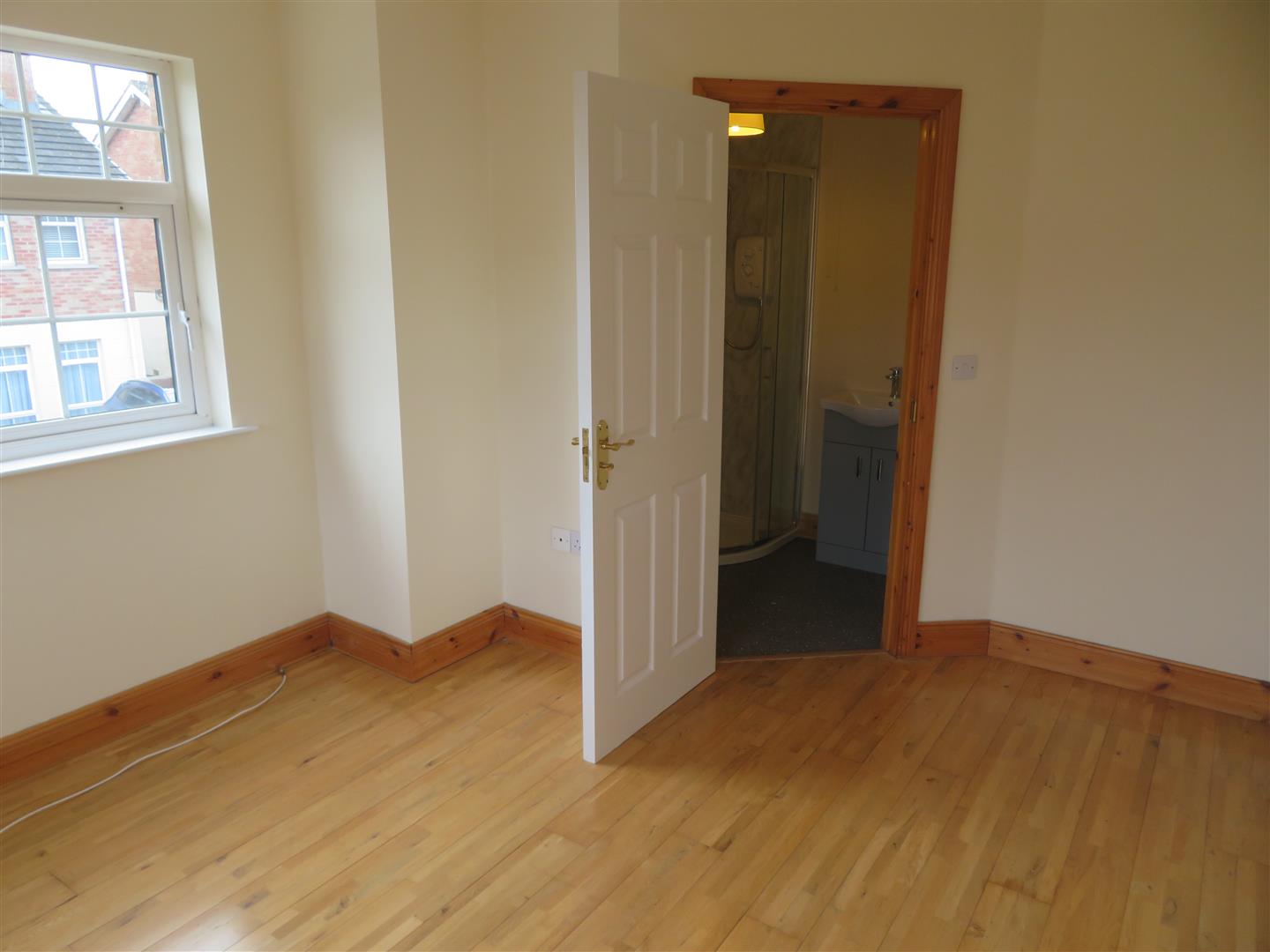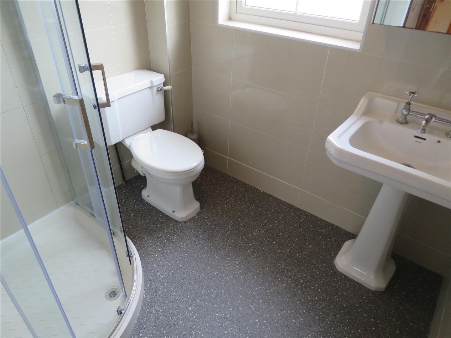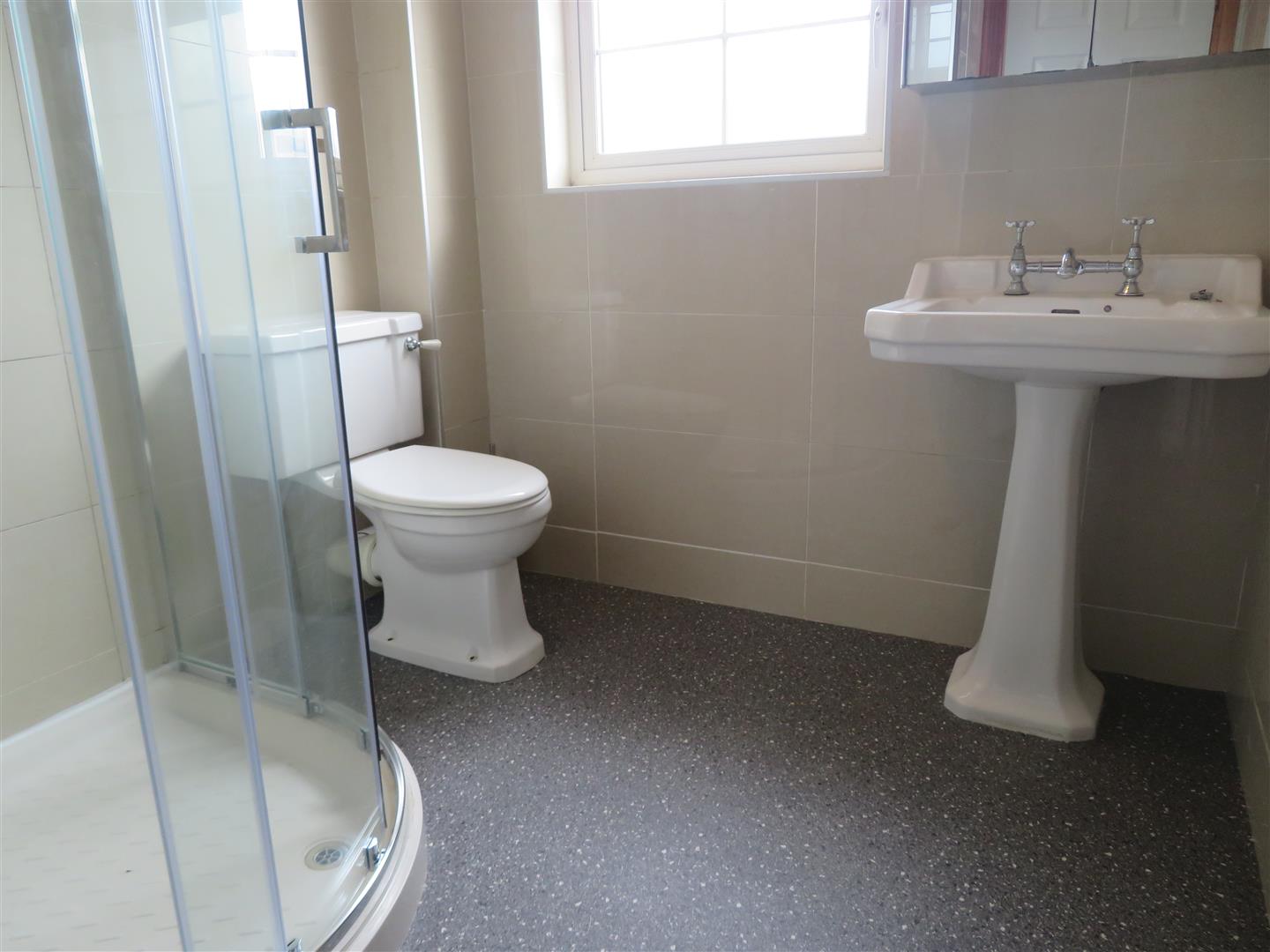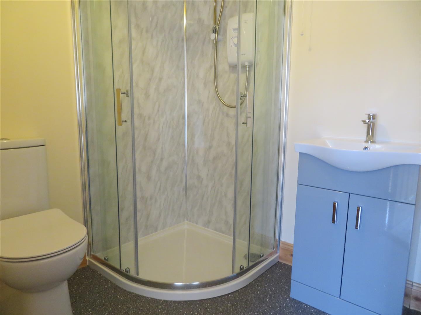 Brand new fitted suit comprising of WC, corner shower unit with electric shower and PVC paneling, wash hand basin with vanity unit. Vinyl flooring.
