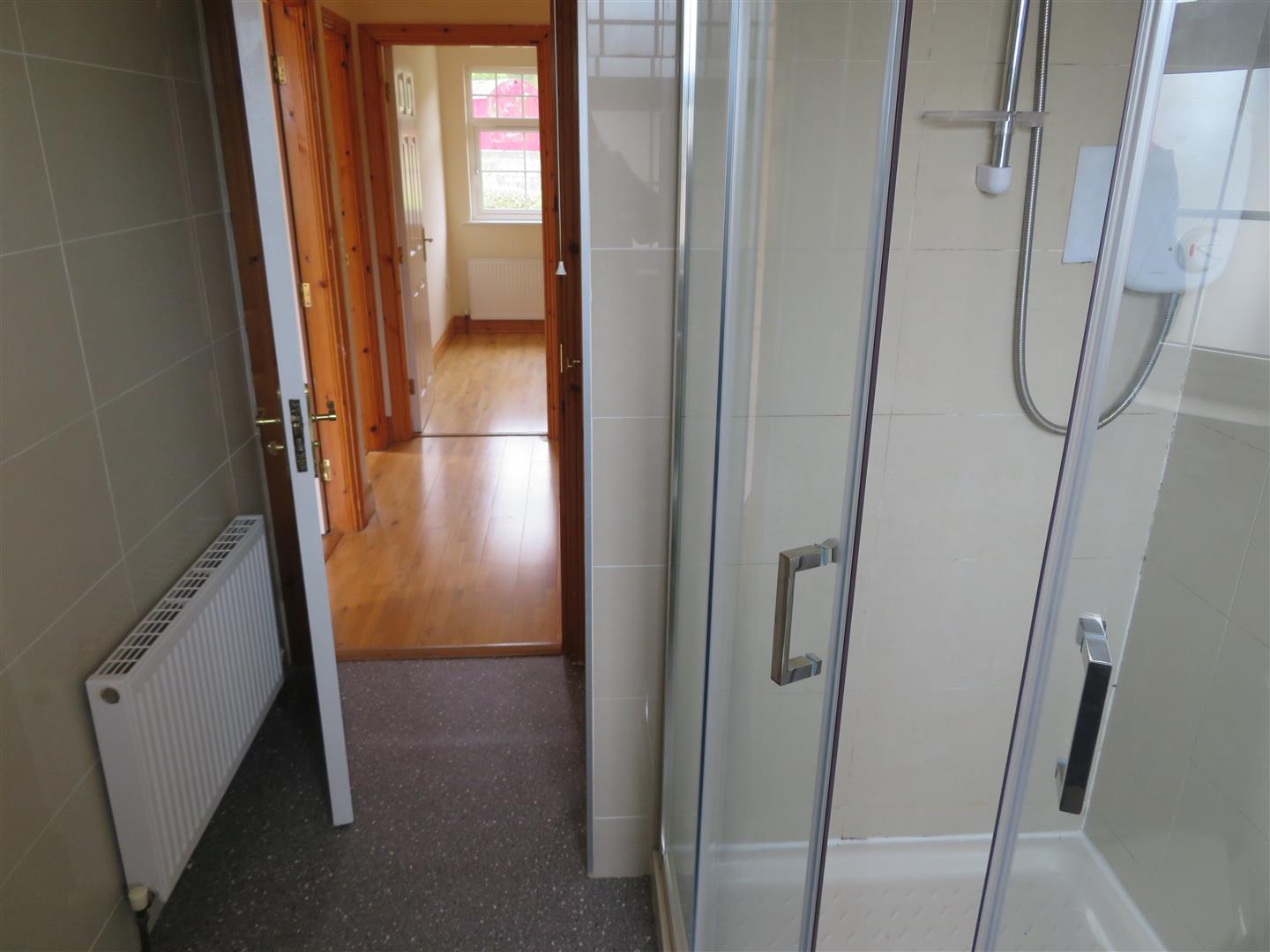 Corner shower cubicle with electric shower, WC and pedestal wash hand basin. Built in hot press. Fully tiled walls and floor.