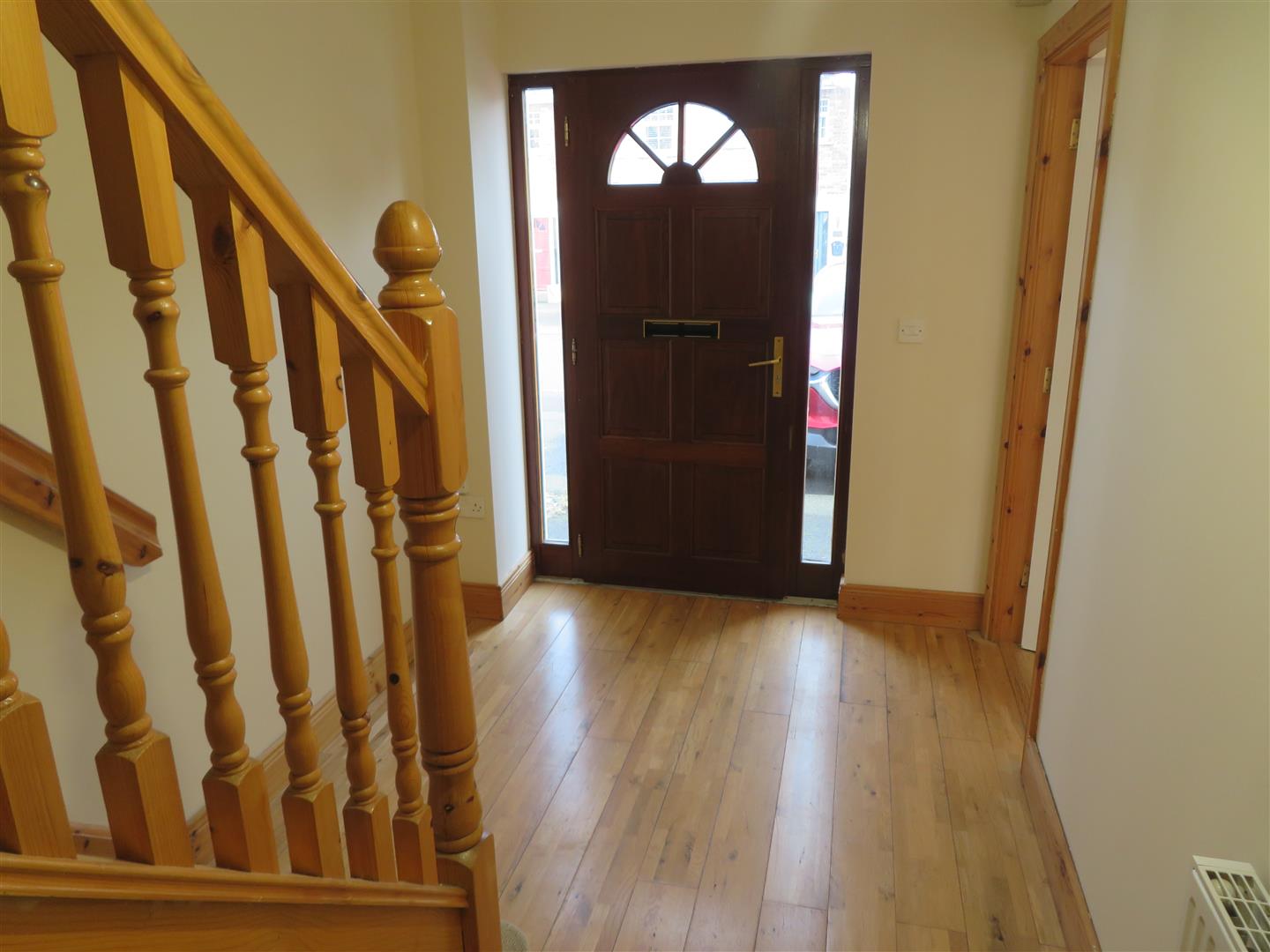 Timber front door with double glazed sidelights, solid wood flooring.