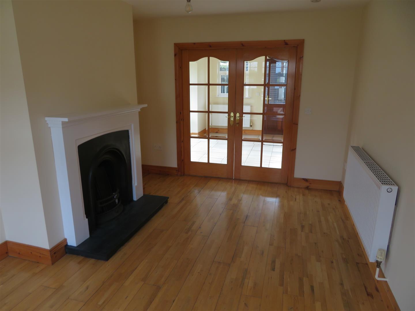 Timber fireplace with tiled hearth and open firer. Solid wood flooring and double, glazed doors to kitchen.