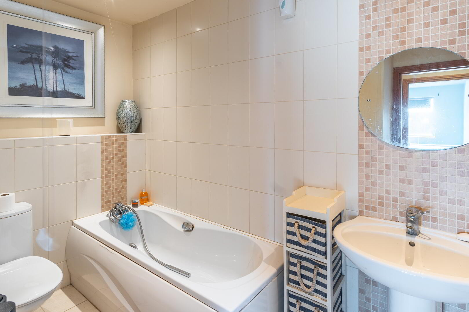 White suite comprising low flush WC, pedestal wash hand basin, panel bath with shower extension, tiled flooring, partially tiled walls.
