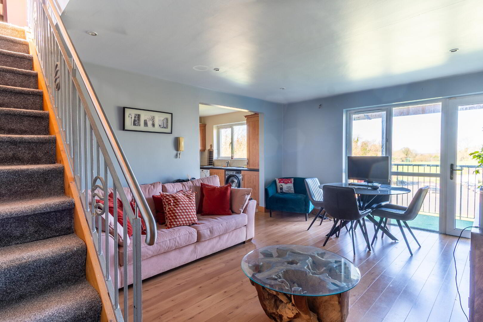 Partially glazed PVC door, solid wood flooring, storage cupboard.