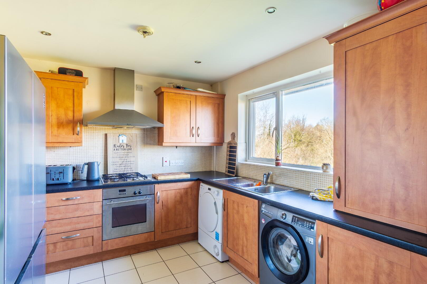 Solid wood units, tiled flooring, tiled splash back, fitted oven, fitted gas hob, stainless steel extractor hood.
