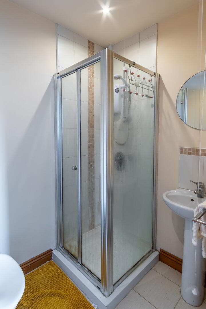 White suite comprising low flush WC, pedestal wash hand basin, electric shower with enclosure, tiled flooring.