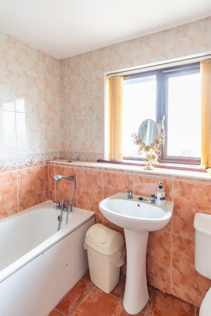 Fully tiled walls and flooring, white suite comprising low flush WC, pedestal wash hand basin, panel bath with shower extension and electric shower above.