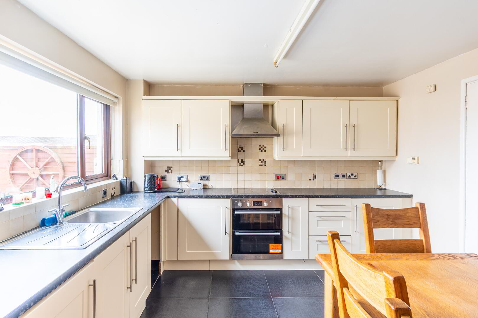 Laminate units, tiled flooring, tiled splash back, fitted oven, fitted glass hob, stainless steel extractor hood, storage cupboard.