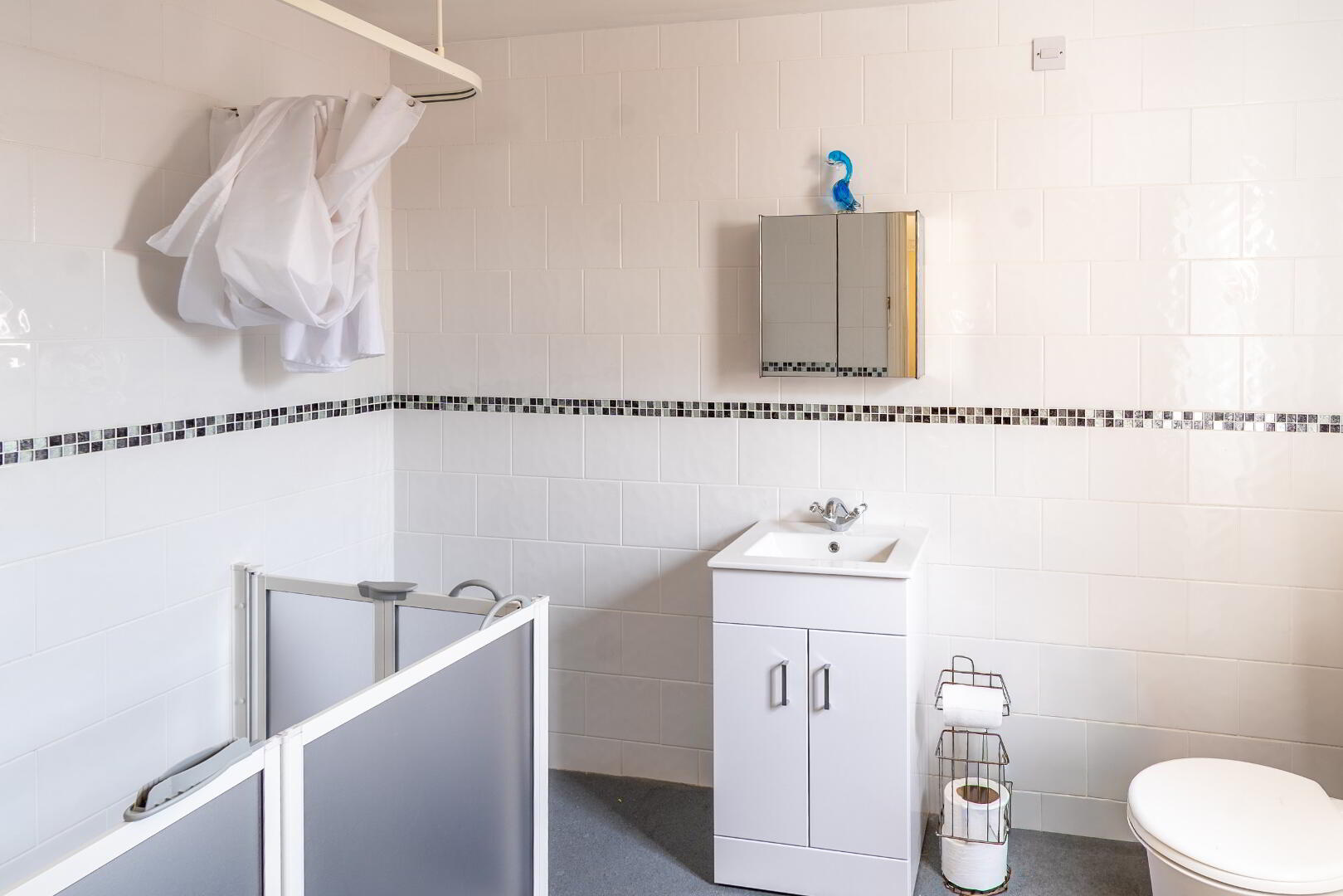 White suite comprising low flush WC, vanity wash hand basin, shower with disabled access shower enclosure, non-slip flooring, tiled walls, attic access point.