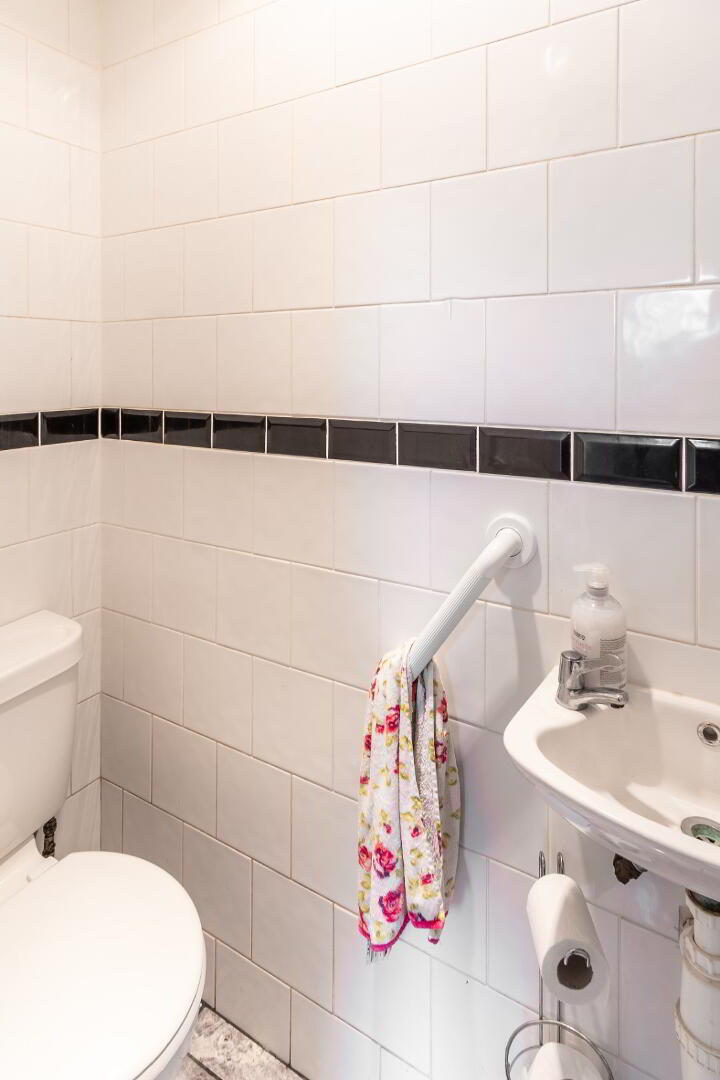 White suite comprising low flush WC, wall mounted wash hand basin, tiled walls.