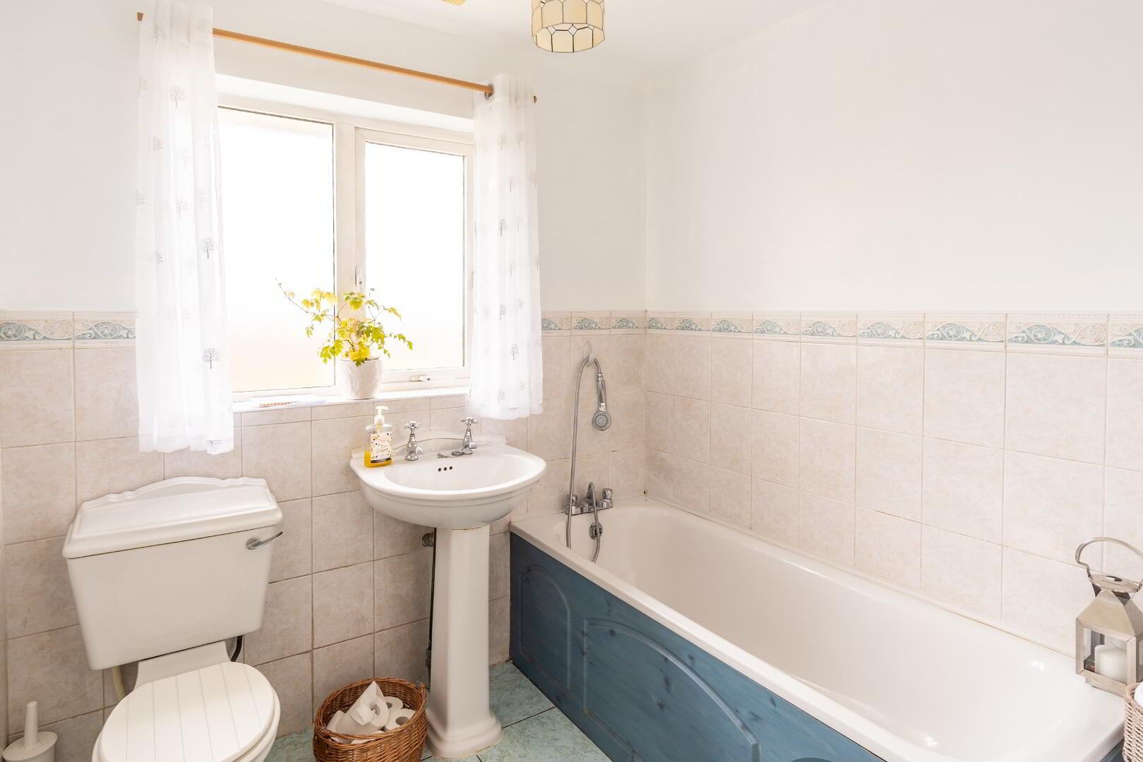 Fully tiled walls and flooring, white suite comprising low flush WC, pedestal wash hand basin, panel bath with shower extension.