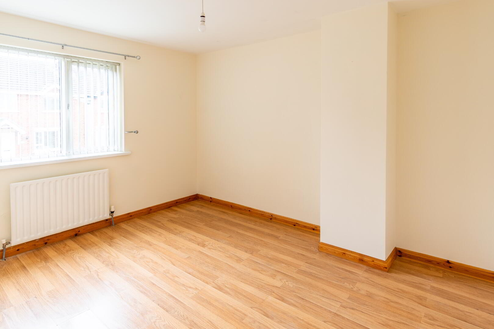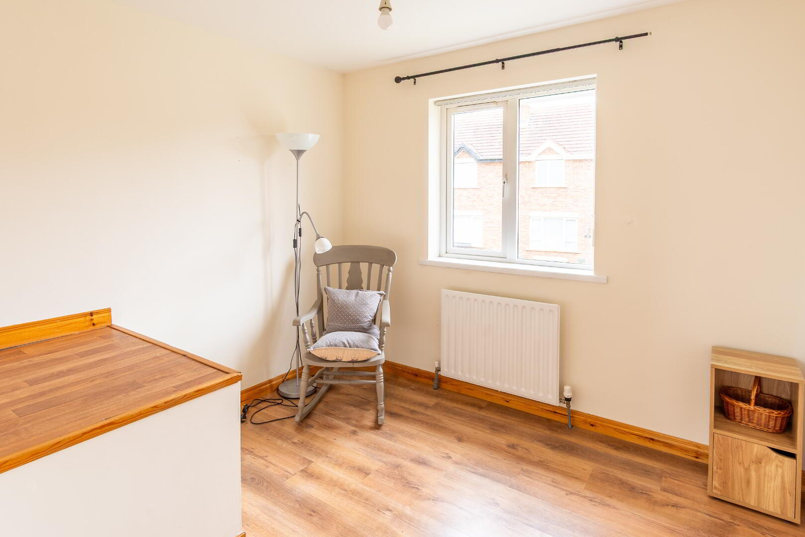Laminate flooring, open cast iron fireplace with decorative tile inserts and timber surround.