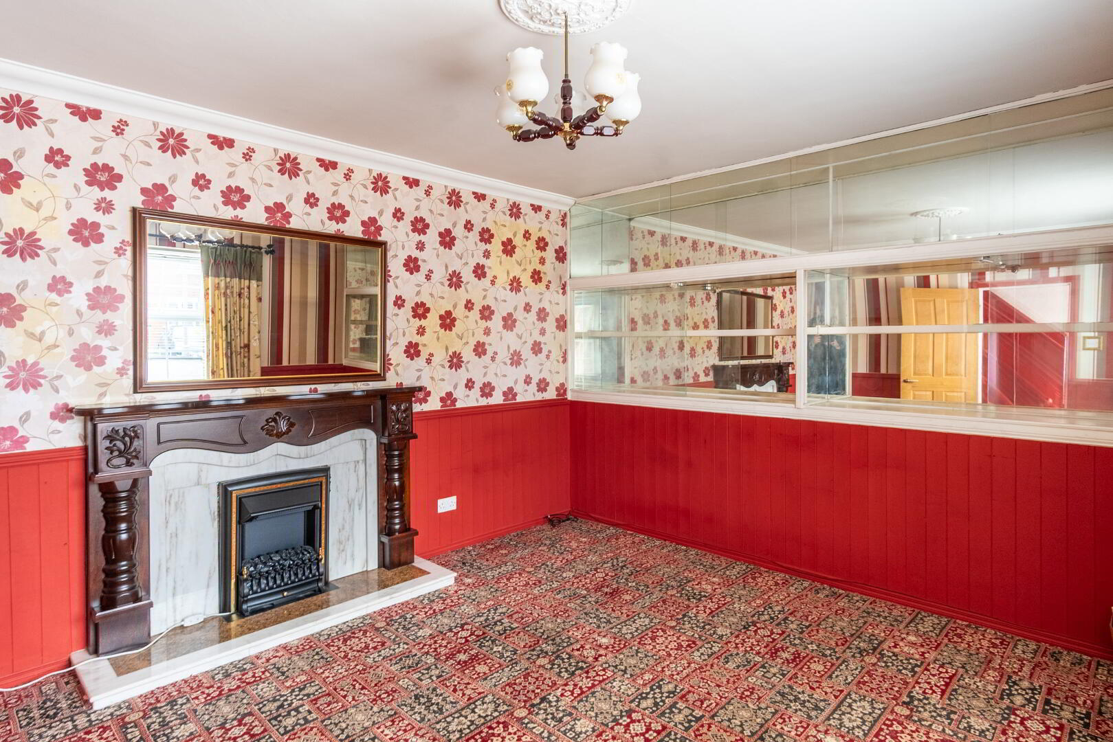Marble fireplace with carved mahogany surround and electric insert, built-in display cabinet.