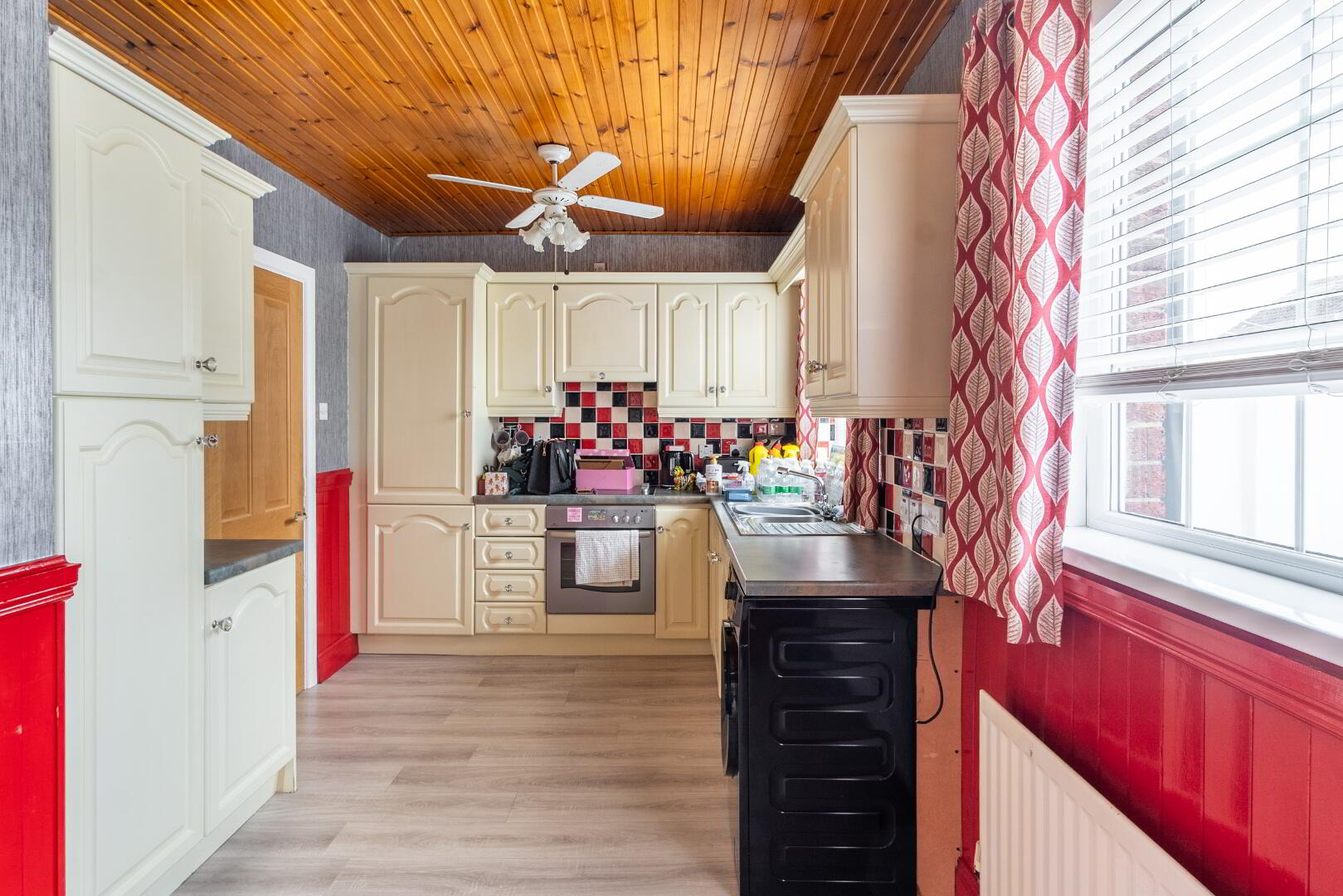 Painted units, tiled splash back, integrated extractor fan, fitted oven and glass hob.