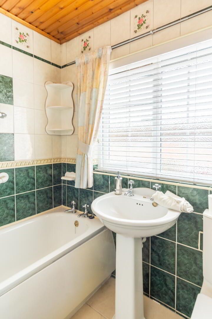 White suite comprising low flush WC, pedestal wash hand basin, panel bath with electric shower above, fully tiled walls and flooring.