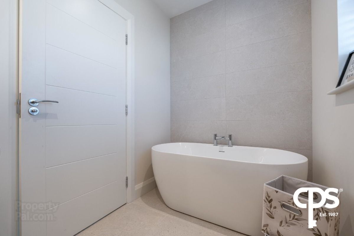 - Freestanding bath, drench head showers, wall hung vanity units, heated chrome towel rails & LED mirrors