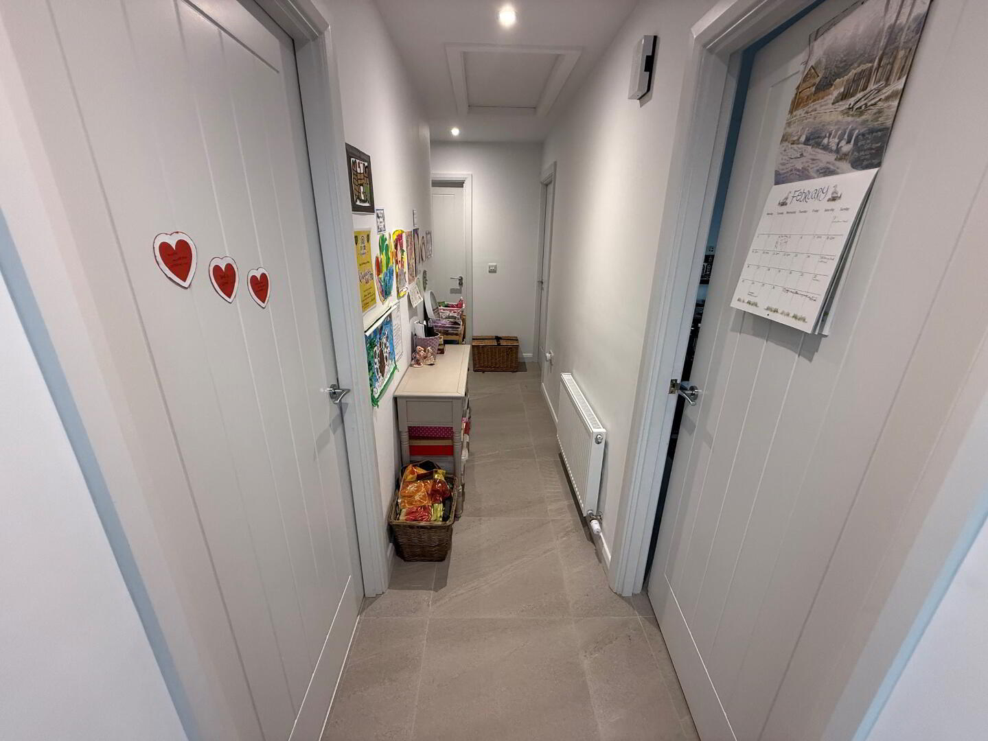 5.6m x 1.78m (18' 4" x 5' 10") uPVC front door with glazed centre glass panel, tiled floor, access to roof space, radiator, recessed lighting.