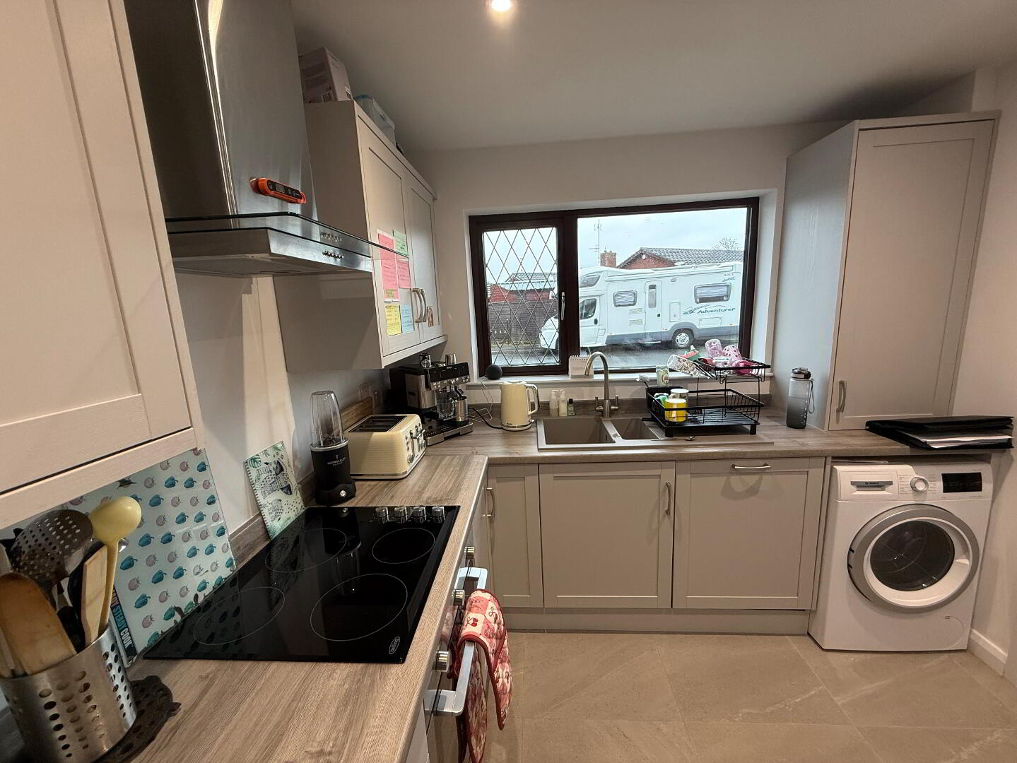 4.19m x 1.62m (13' 9" x 5' 4") Range of high and low level units, single oven, electric hob with stainless steel extractor fan over, integrated fridge, laminate worktops, integrated dishwasher, space for washing machine, one and half 'Pyramis' sink with mixer tap, tiled floor, uPVC back door with glazed panel.