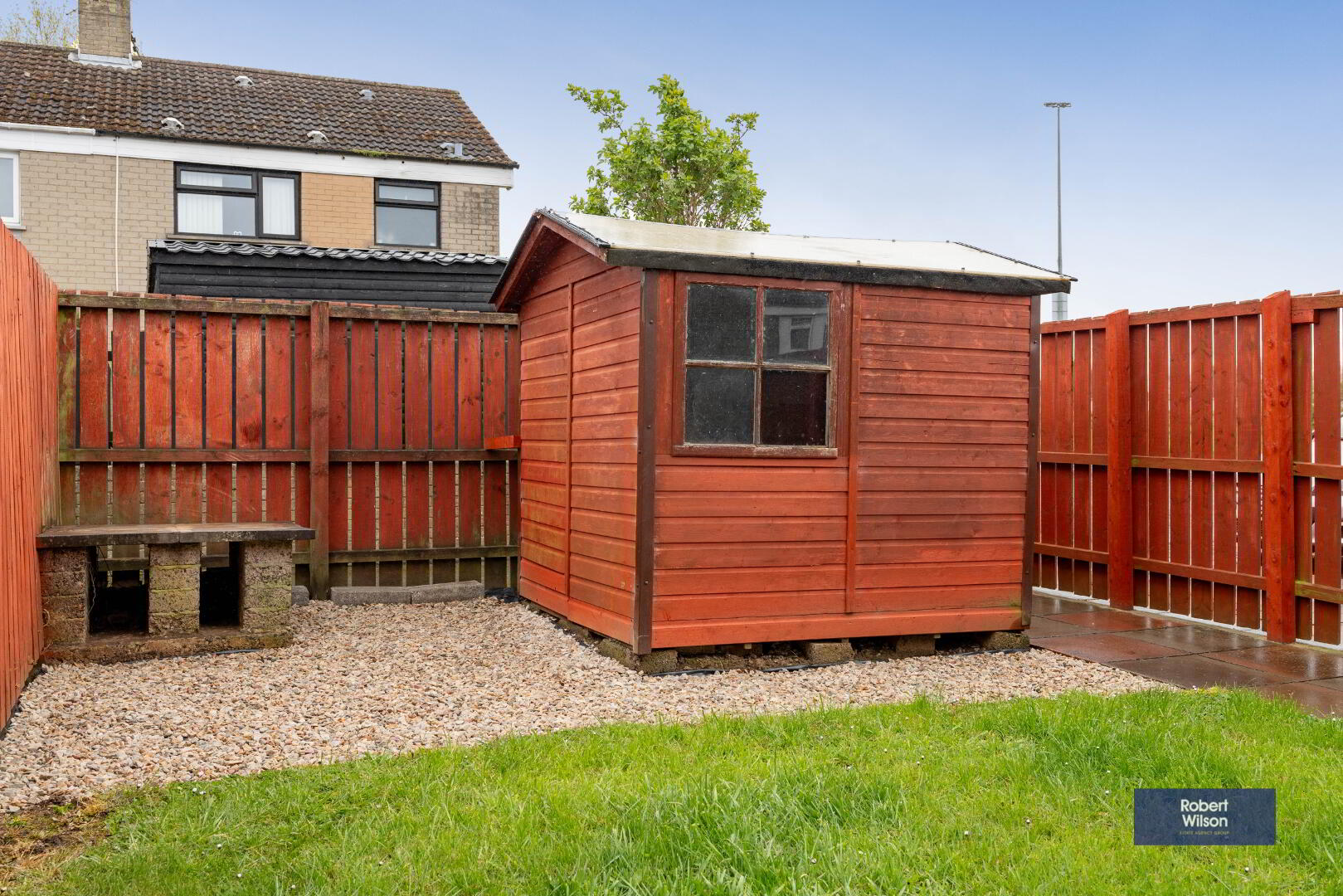 Rear garden paved patio area and garden laid in lawn, outside tap pebbled area, large shed with electric & socket, fully enclosed with timber fencing.