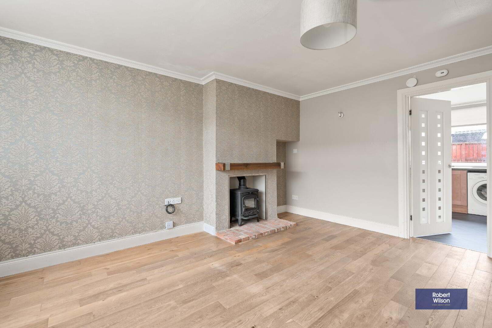 The home welcomes you with a charming brick-built porch leading into a spacious entrance hallway. The living room is both cosy and contemporary, featuring a solid wooden floor, a feature beam fireplace, and a stove set on a brick hearth—perfect for relaxing evenings. Glass-panelled doors lead through to a generous kitchen and dining area, fitted with an integrated hob and oven, and offering ample space for additional appliances. A useful under-stair storage cupboard adds practicality, while a half-glazed uPVC door provides access to the rear garden.