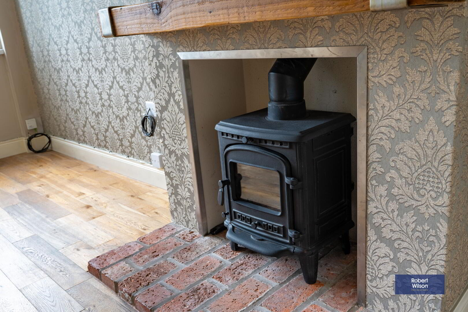 4.51m x 4.45m (14' 10" x 14' 7") Natural wooden flooring, ceiling cornice, stove set on a brick built hearth with sleeper mantle, wall lights, double panel radiator, glass panelled door to .....