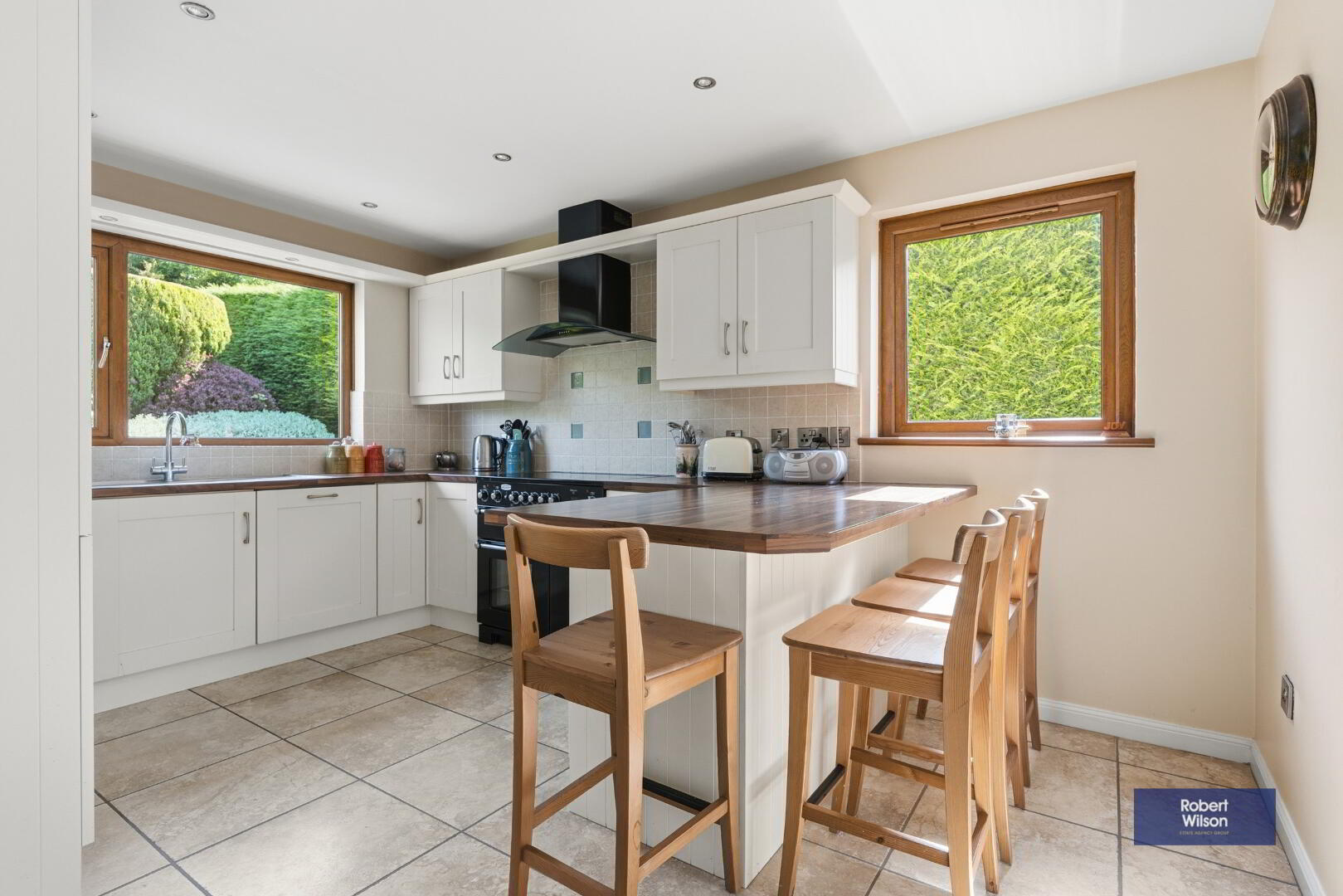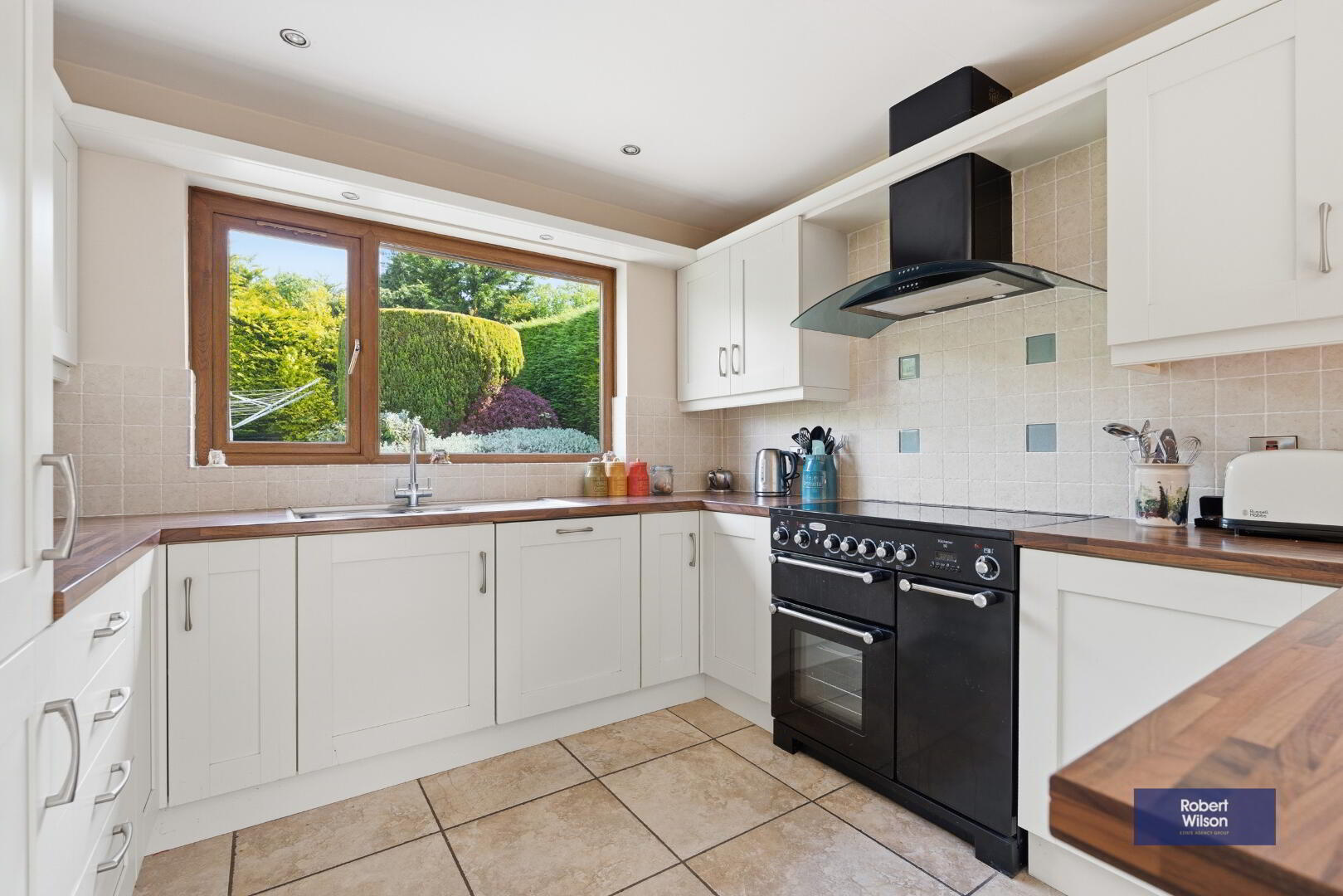 Range of high & low level units in cream, glazed display unit, breakfast bar with units under, 1.5 stainless steel sink unit, mixer tap, integrated dishwasher. Space for 5 ring electric cooker with extractor fan over, recessed lights.
