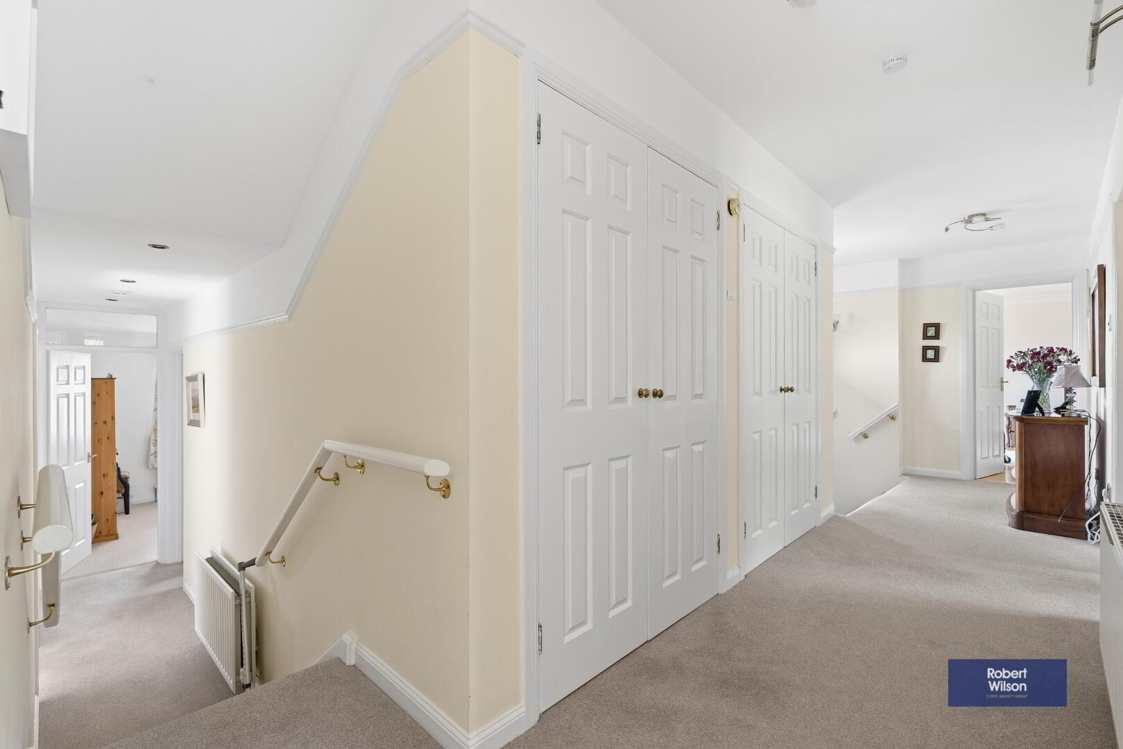 Tiled front step, outside light, wood effect uPVC front door with glazed centre piece & 2 side lights. Tiled hallway floor with 3 steps leading to the main carpeted hallway housing 2 built in robes with shelving, access to loft via pull down ladder, double panel radiator, Dato rail wall lights.
