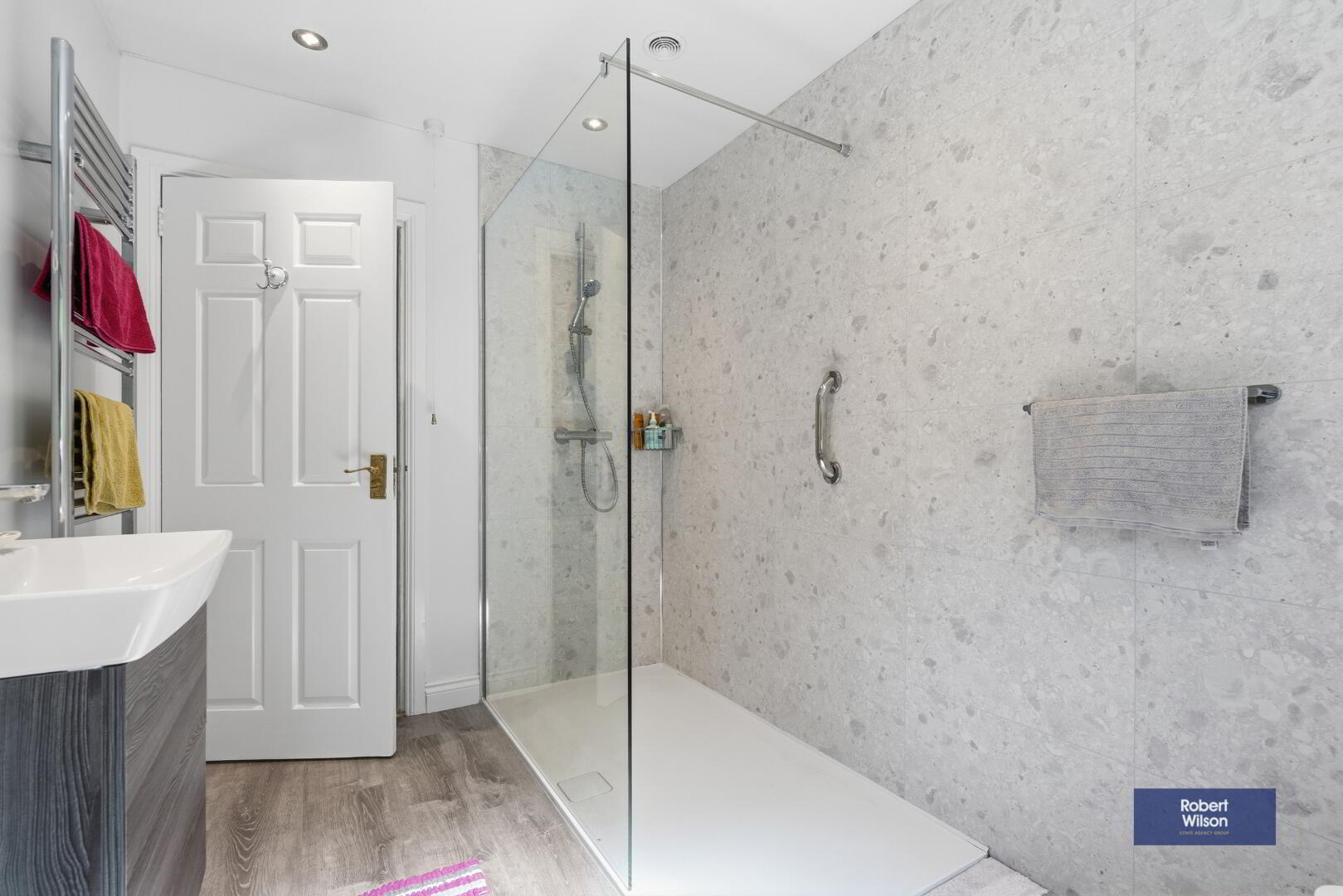 3.01m x 2.05m (9' 11" x 6' 9") 3 piece white suite comprising, low flush WC, vanity unit incorporating wash hand basin, open plan shower cubicle with thermostatic controlled shower unit, extractor fan, recessed lights, part tiled walls, wood laminate flooring.