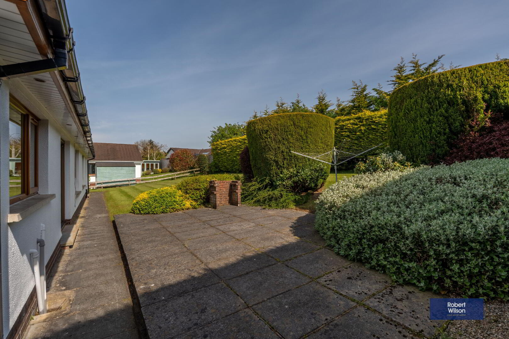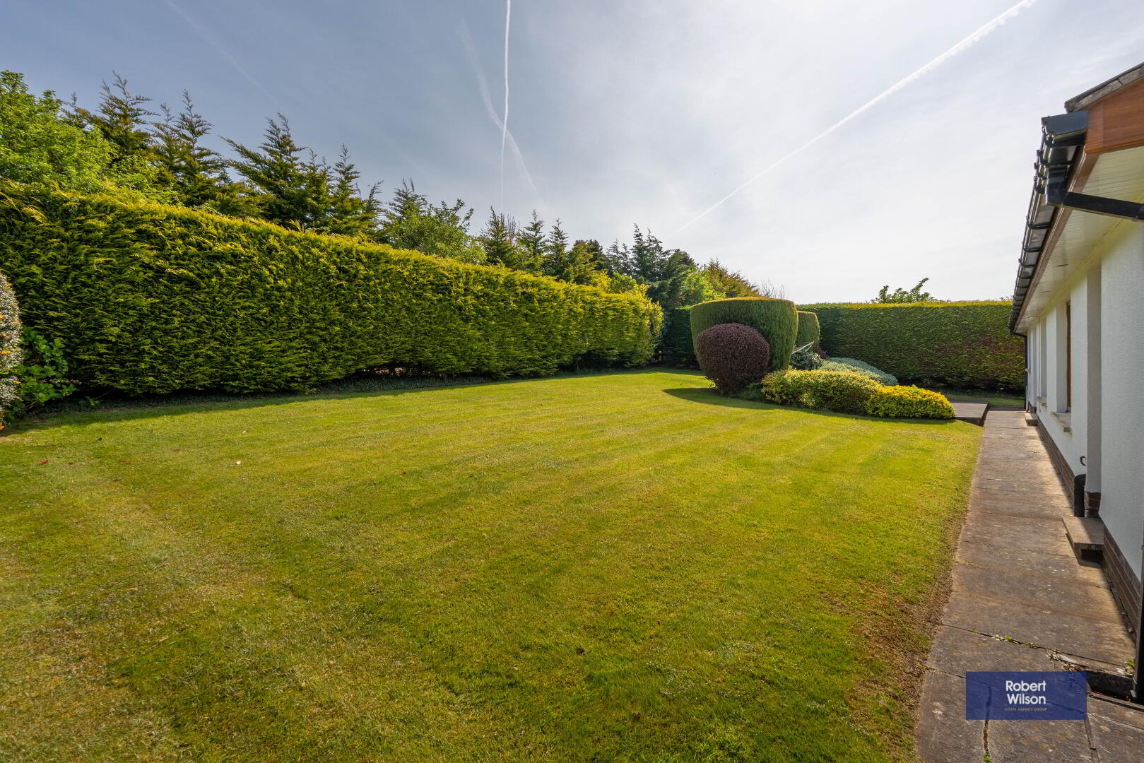 Front garden laid in meticulous lawn with boundary housing mature plants, shrubs & trees, spacious tarmac driveway to attached garage. Paved pathway surrounding the property, timber fencing.
